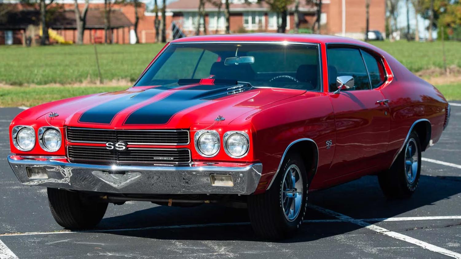 The 1970 Chevrolet Chevelle LS6 is often cited as the ultimate expression of the factory muscle car era. This specific example wears a bold Code 75 Cranberry Red finish accented by classic black racing stripes. It benefited from a meticulous rotisserie restoration in 2010 and has been kept in a garage to preserve its concours-level condition.
