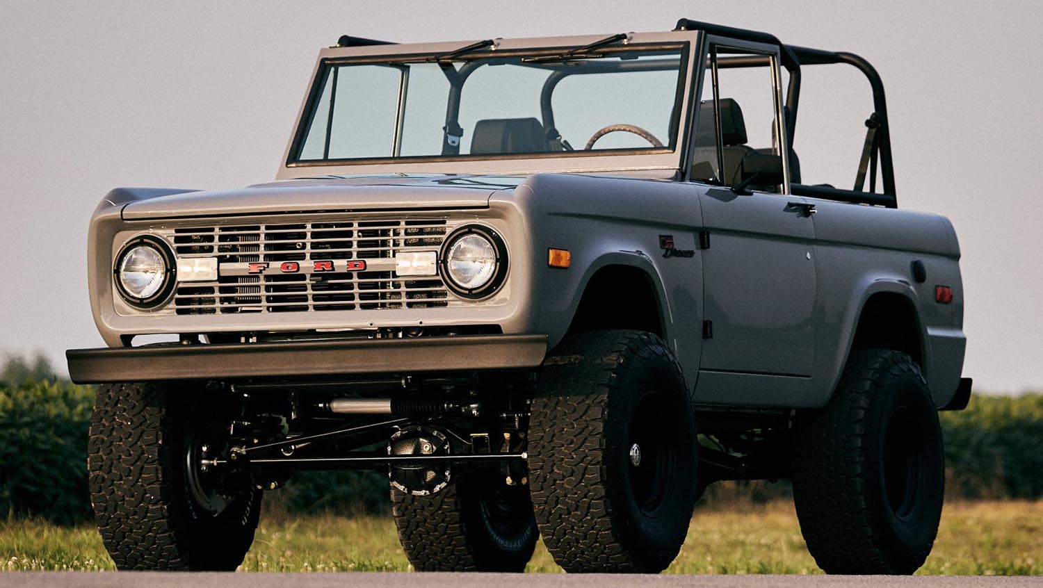 The exterior of this 1970 Ford Bronco is finished in a sleek Nardo Gray, a color often associated with modern performance cars. This paint choice provides a sharp contrast against the black-finished bumpers and the black bikini top. To achieve its commanding presence, the truck utilizes both body and suspension lifts for improved ground clearance. It rolls on 15-inch black steel wheels wrapped in 33-inch BFGoodrich All-Terrain T/A tires. A matching spare tire is mounted on a swing-away rear carrier for easy access. Furthermore, power steering and power-assisted front disc brakes ensure the truck is easy to handle on the street. Manually locking hubs at the front allow for traditional four-wheel-drive engagement when the trail gets difficult. The frame has been modified to accommodate these upgrades, ensuring structural integrity during off-road use. Every exterior detail was selected to balance rugged capability with a clean, modern aesthetic. Consequently, the truck looks equally at home on a coastal highway or a forest trail.