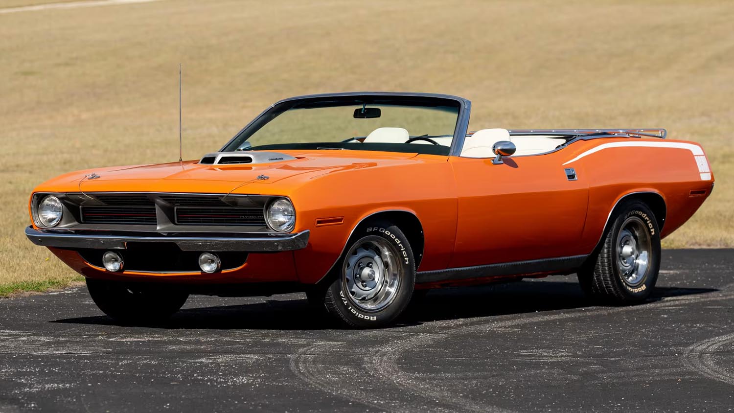 The exterior of this 1970 Plymouth Barracuda Convertible is finished in a vibrant Vitamin C Orange basecoat and clearcoat, a color that perfectly captures the bold spirit of the early seventies. Its silhouette is dominated by the legendary Shaker hood, which serves as a functional intake for the massive engine underneath. The car sits with a muscular stance on 15×7-inch Rallye wheels, while the white convertible top provides a sharp contrast to the bright bodywork. Every chrome trim piece and badge has been refreshed to reflect the quality of its top-tier restoration, maintaining the aggressive yet refined look that made the Barracuda a legend.