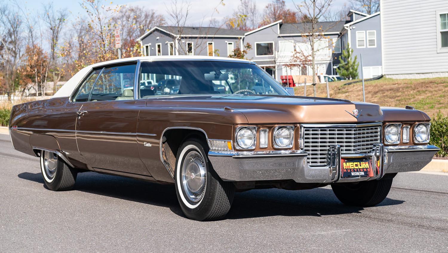 This Calais was finished from the factory in Cognac with a white vinyl roof that enhances its long profile. The coupe shape brings wide doors, subtle creases, and a clean shoulder line. Quad headlights, cornering lights, and rear fender skirts add period accuracy. The paint pairs well with the polished trim, giving the car a warm, vintage presence.