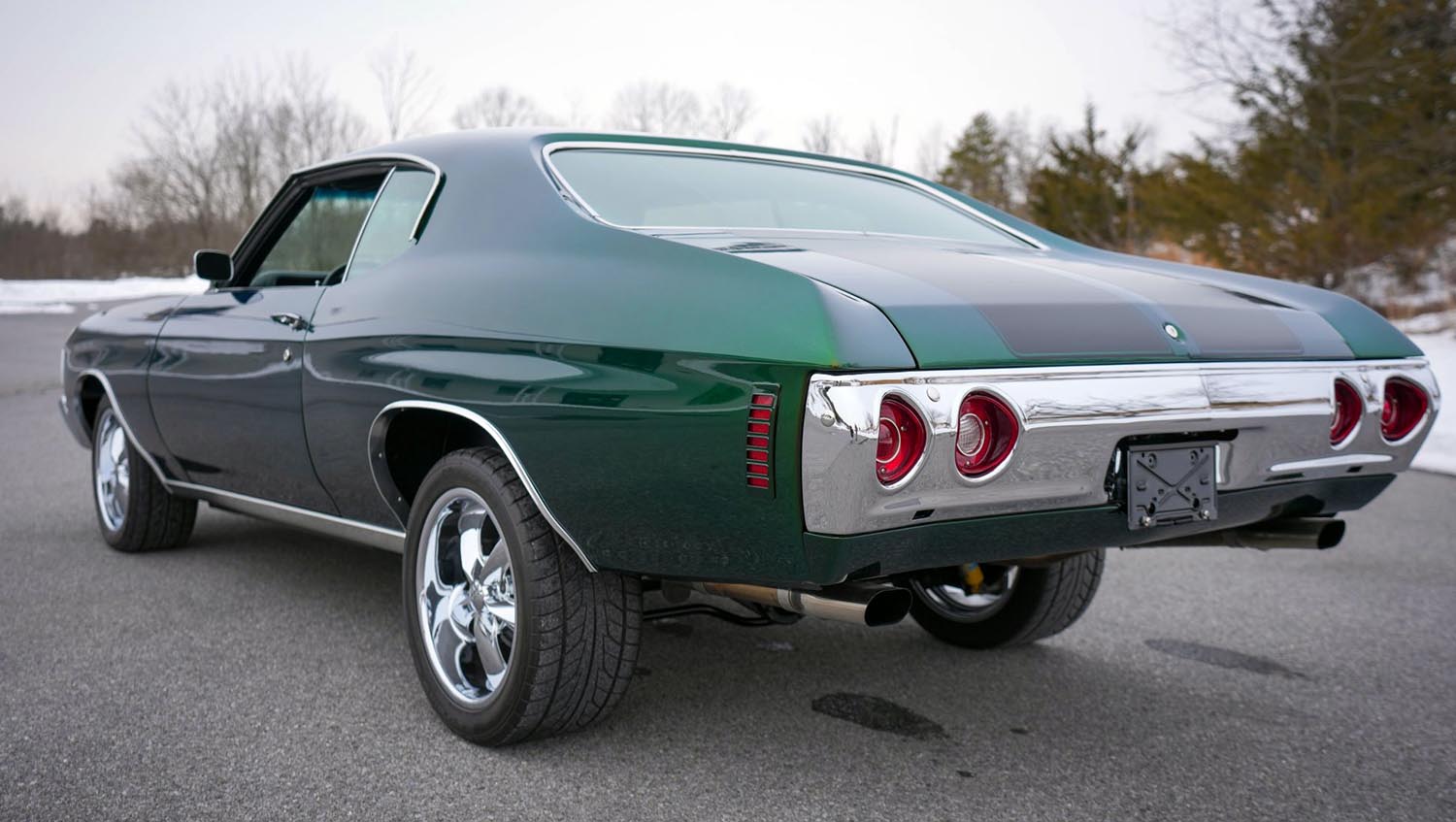 Supporting the added power required a complete rethink of the original 1972 Chevrolet Chevelle Malibu chassis. The frame was stripped via media blasting and protected with a durable powder-coated finish. Bilstein shocks and polyurethane bushings were installed to sharpen the handling characteristics of the heavy coupe. Front and rear sway bars work together to minimize body roll during tight cornering maneuvers. Furthermore, the car features power-assisted front disc brakes to provide reliable stopping power. Staggered-width Nitto NT555 tires are mounted on chrome 17-inch Foose wheels to provide a modern footprint. This combination allows the car to track straight and feel planted at higher speeds.