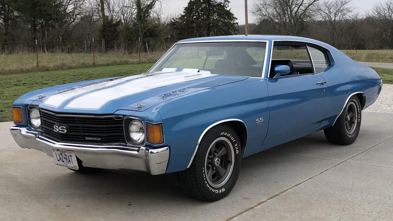 The visual character of this Chevelle is defined by its factory-correct Code 26 Mulsanne Blue paint, which has been applied over the original sheet metal to ensure an authentic silhouette. A functional cowl induction hood sits prominently at the front, paired with the classic SS blacked-out grille and horizontal headlights that mark the 1972 model year. White racing stripes stretch across the hood and trunk, emphasizing the car’s muscular proportions and wide stance. Chrome bumpers and polished trim pieces provide a sharp contrast to the deep blue finish, creating a mirror-like shine that reflects the high quality of the recent frame-up restoration.