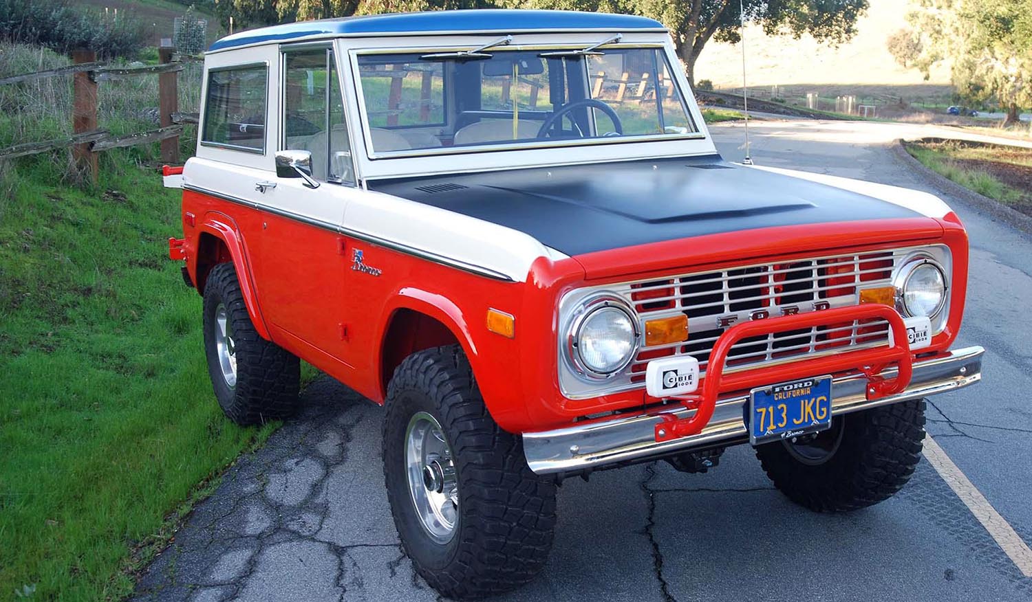 The exterior of this 1973 Ford Bronco Bill Stroppe Baja wears the iconic Calypso Coral, Wimbledon White, and Astra Blue finish. During its recent refurbishment, the body received replacement doors and a fresh fender before the high-quality repaint was applied. A classic “Cactus Smasher” pushbar protects the front end, accompanied by powerful Cibie auxiliary lights for night excursions. The removable hardtop provides versatility for open-air adventures or sheltered cruising during inclement weather. Chrome bumpers and a rear-mounted spare tire carrier complete the purposeful off-road silhouette. Every detail, from the louvered hood to the bright trim, honors the original Baja conversion package. It is a striking visual package that remains unmistakable on any road or trail.
