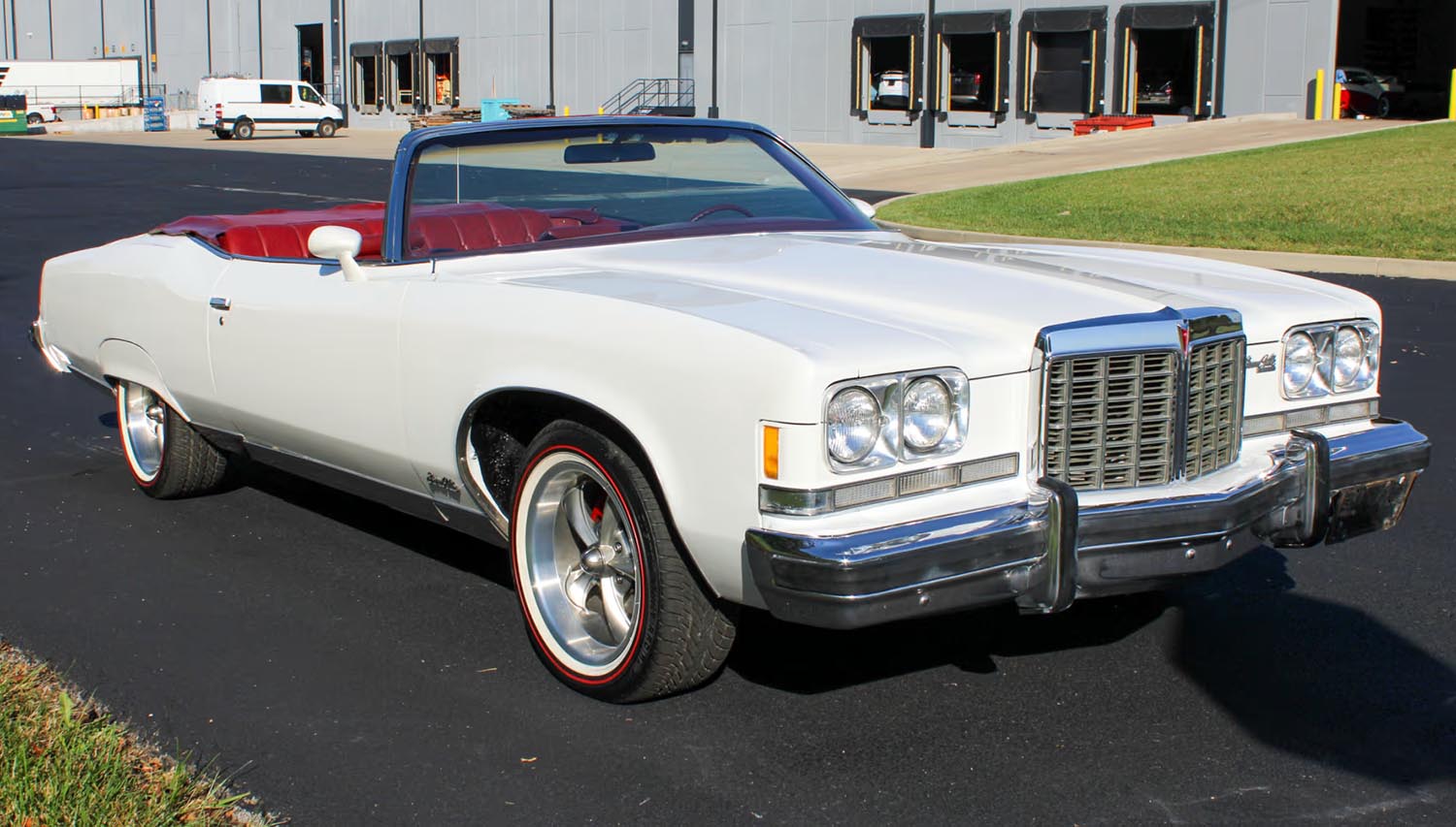 The exterior of this 1974 Pontiac Grandville is defined by its fresh application of Cadillac White Pearl paint, a finish that adds a contemporary depth and shimmer to the classic body lines. This brilliant hue is perfectly contrasted by a brand-new Red convertible top, which is power-operated for ease of use and maximum curb appeal. The massive silhouette is further modernized by the addition of new Ridler wheels wrapped in classic whitewall tires, bridging the gap between vintage charm and custom flair. Retaining its imposing wide-track stance, the car features well-preserved chrome accents that highlight its flagship status. This combination of pearl tones and vibrant red creates a visual profile that is far more dynamic than a standard factory finish.