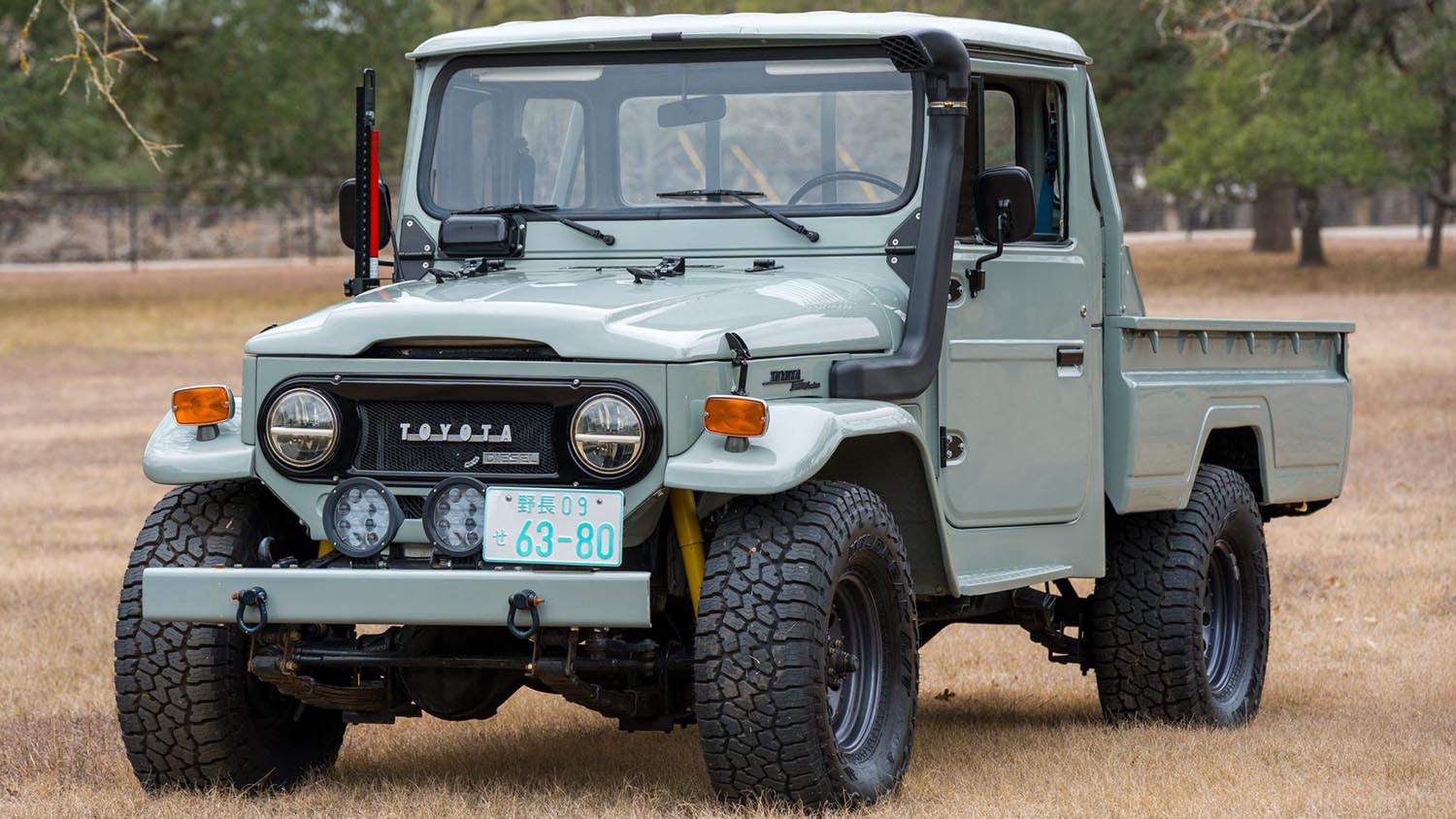 Reliability on the trail requires more than just a strong engine, which is why the chassis features several key upgrades. This 1974 Toyota Land Cruiser FJ45 sits on 15-inch steel wheels wrapped in 33-inch Falken Wildpeak tires. Power steering and front disc brakes make the driving experience much more manageable on modern roads. The brake system received a full overhaul, including a new master cylinder and booster pump. A snorkel and a Hi-lift jack are mounted to the exterior to provide extra security during off-road excursions. These modifications transform the classic pickup into a truly capable overland vehicle. It is ready for any adventure.