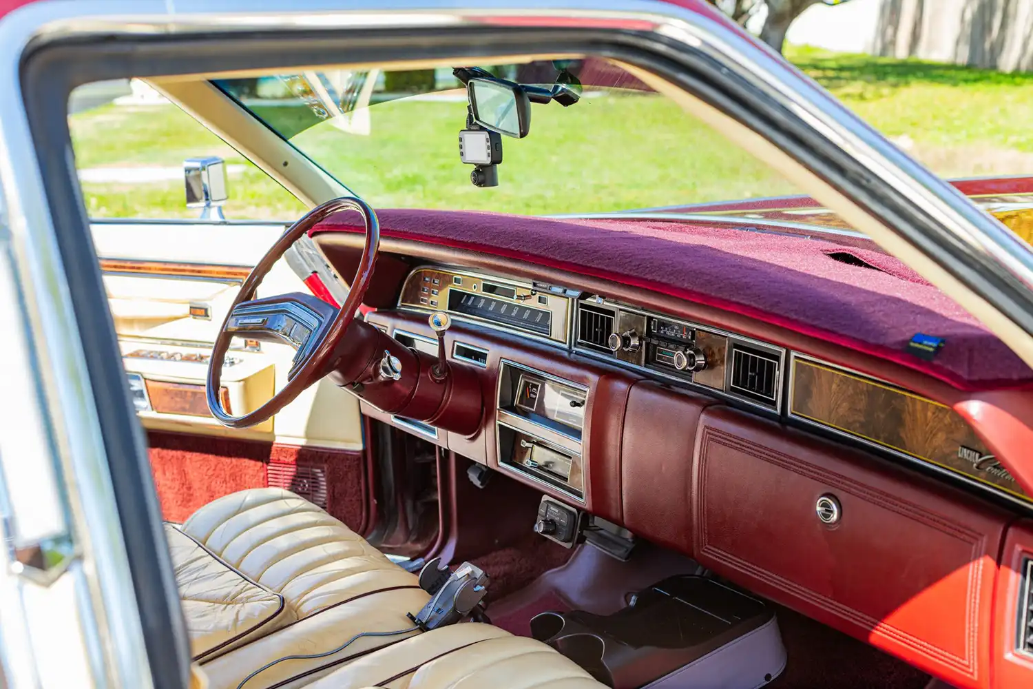 Luxurious Cream Leather Interior with Modern Audio: The interior of this 1977 Continental Town Car is upholstered in supple Cream leather with contrasting Dark Cordovan piping, creating a refined and comfortable environment. The power-adjustable front Twin Comfort Lounge seats offer exceptional comfort and adjustability for both the driver and front passenger. Classic features include an electric clock, power windows and locks, and a rear window defroster. Modern enhancements include a Kenwood Bluetooth-capable stereo controller linked to an amplifier, a Rockford Fosgate subwoofer, and aftermarket speakers, providing a significant upgrade to the audio experience. Subtle LED accent lighting has been added under the dashboard and the back of the front seats, controllable via a mobile phone app, adding a contemporary touch to the classic interior ambiance. The car is also equipped with cruise control and automatic temperature control for added convenience on longer journeys.