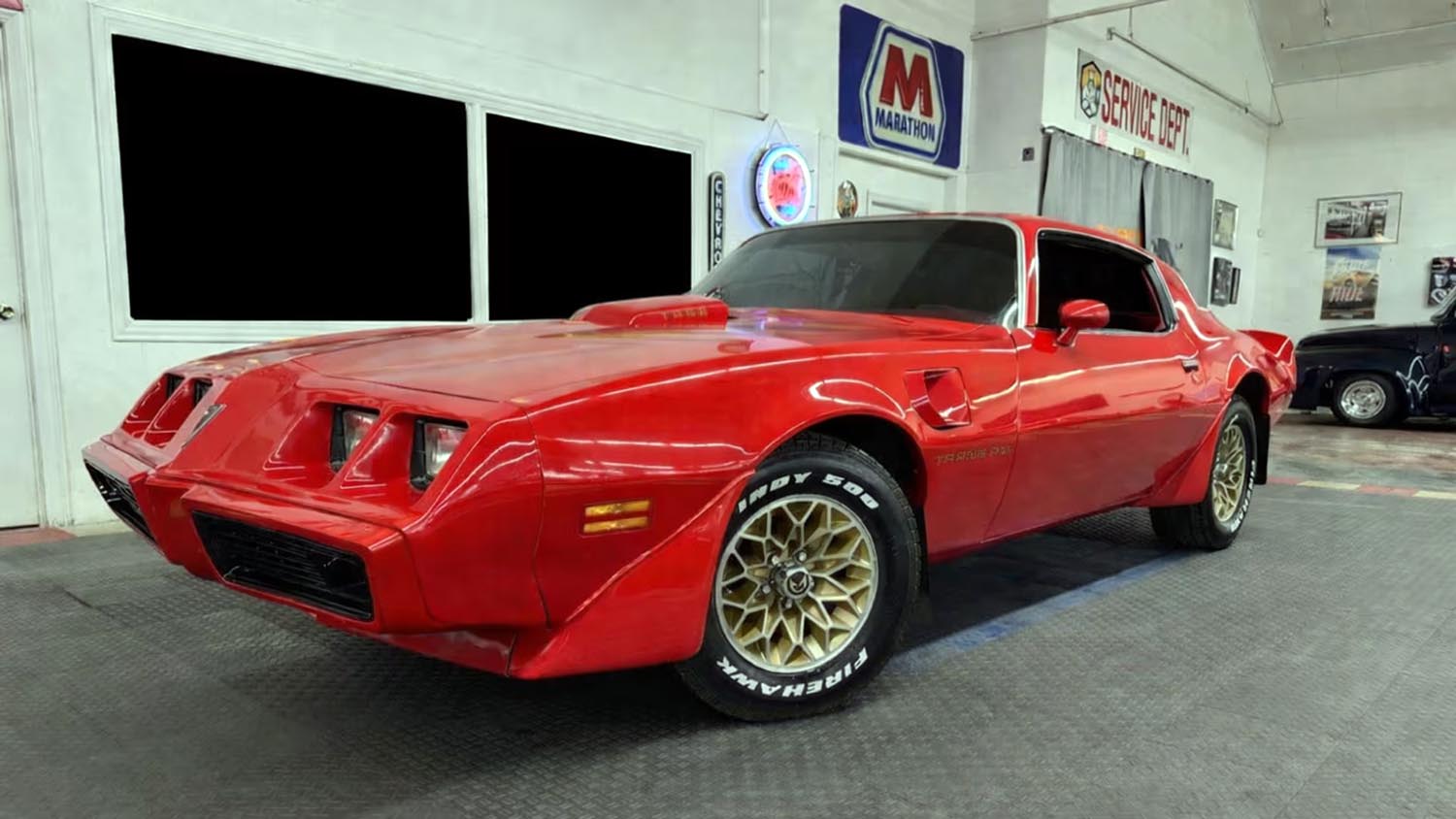 Stepping inside reveals a vibrant red interior that was comprehensively refreshed in 2025 to maintain its factory-fresh appeal. The cockpit features the iconic engine-turned instrument panel, a hallmark of Trans Am luxury and performance branding during the late seventies. Occupants are greeted by a Formula steering wheel and a classic pushbutton radio, while the integration of power steering and power brakes ensures that the cabin remains a comfortable place to manage the considerable dimensions of this vintage muscle icon.