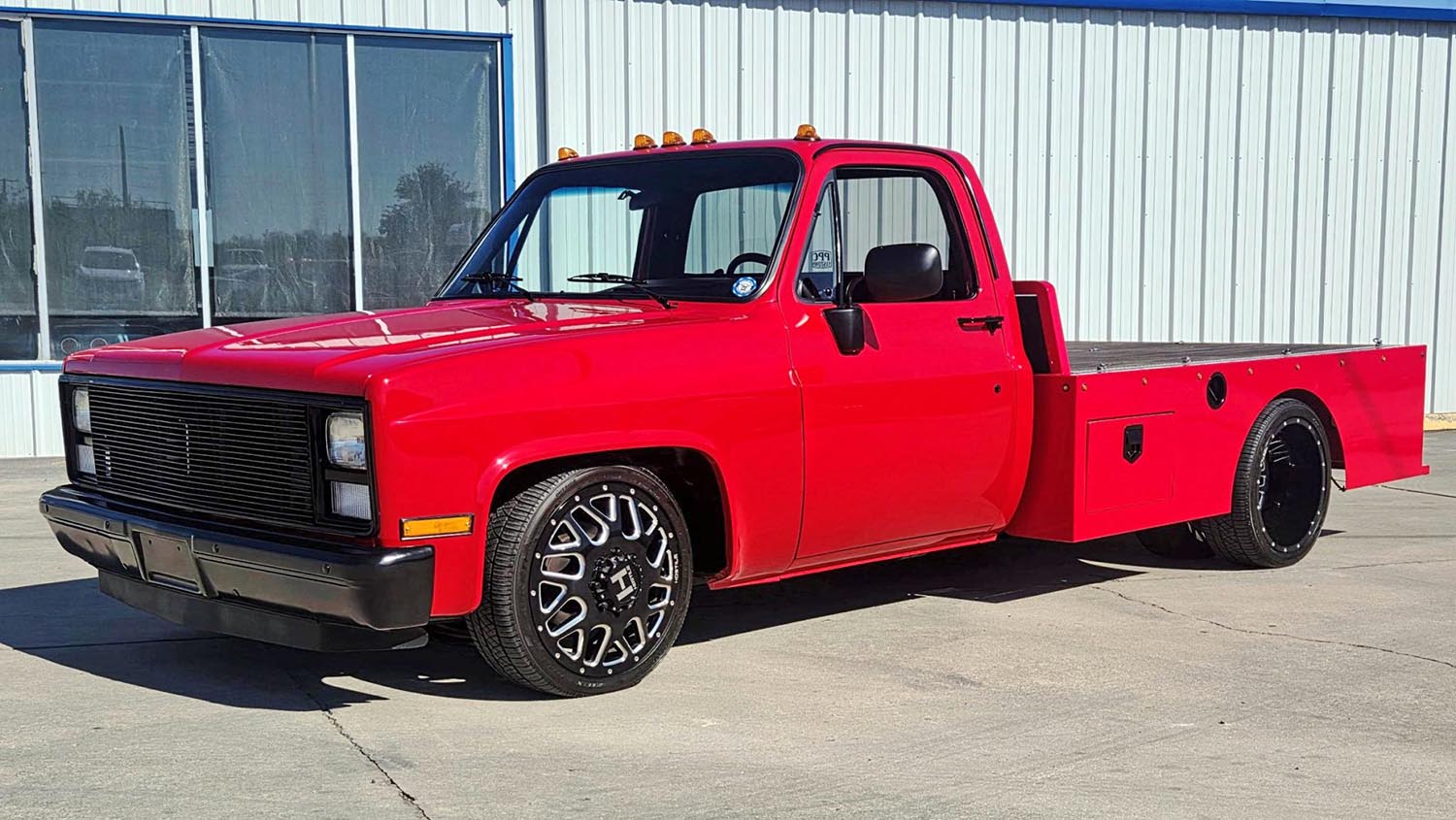 The truck’s aggressive stance is defined by its custom dually rear axle conversion. This modification drastically changes the truck’s profile. The custom flatbed features a beautiful oak wood floor, inlaid for a clean, custom look. It also has practical adjustable tie-downs and LED lighting. The red exterior finish is dramatically contrasted by black accents. These black elements include the grille, front bumper, mirror caps, and door handles. Hostile 20-inch wheels are fitted with performance-oriented Falken Ziex tires.