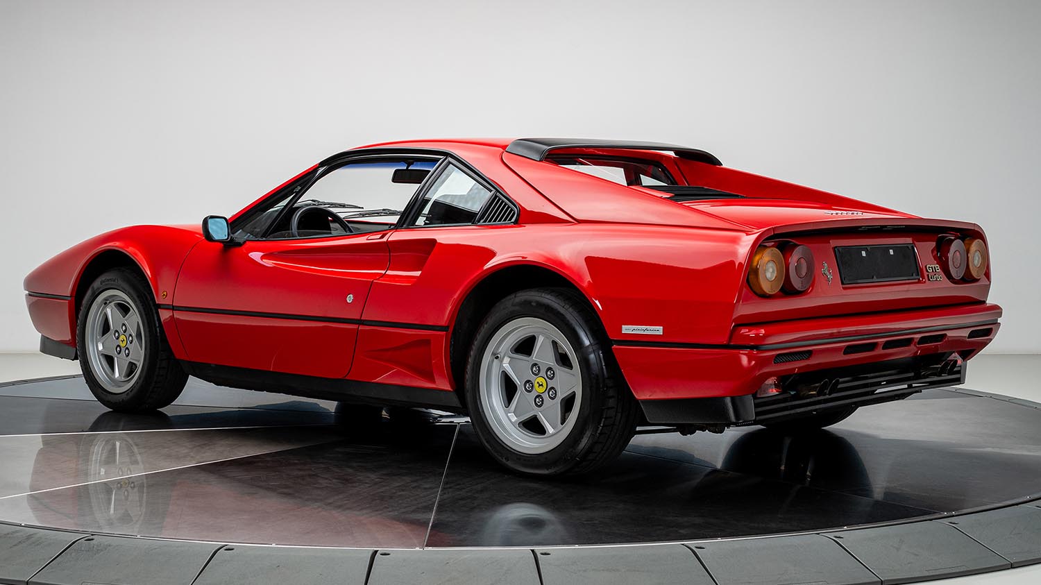 Finished in the quintessential Rosso Corsa (300), the exterior of this GTB Turbo maintains the sharp, aerodynamic lines penned by Pininfarina. While it shares its silhouette with the 328, the Turbo model is distinguished by its unique ducting and a black spoiler mounted over the rear window to manage airflow. Pop-up headlights and quad exhaust tips reinforce its aggressive 1980s aesthetic, while staggered 16-inch Speedline five-spoke alloy wheels provide the classic Ferrari stance. Functional details like the side air intakes are essential for cooling the mid-mounted forced-induction heart, ensuring form always follows function.