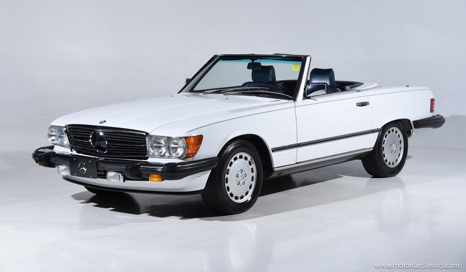 The exterior of this 1989 Mercedes-Benz 560 SL is finished in factory Arctic White (147), a color that perfectly complements the long-hood, short-deck proportions of the Pininfarina-influenced design. Its visual character is defined by the mirror-like chrome trim, integrated front fog lights, and the iconic 15-inch aluminum alloy wheels that were standard for the 560-class. The car is equipped with a Navy Blue soft top and its original color-matched hardtop, offering two distinct silhouettes for varying driving conditions. Every panel retains its original paint and factory tolerances, showcasing a level of preservation rarely seen in the classic market. This design remains a masterpiece of understated elegance, balancing functional aerodynamics with the unmistakable presence of a Mercedes-Benz flagship.