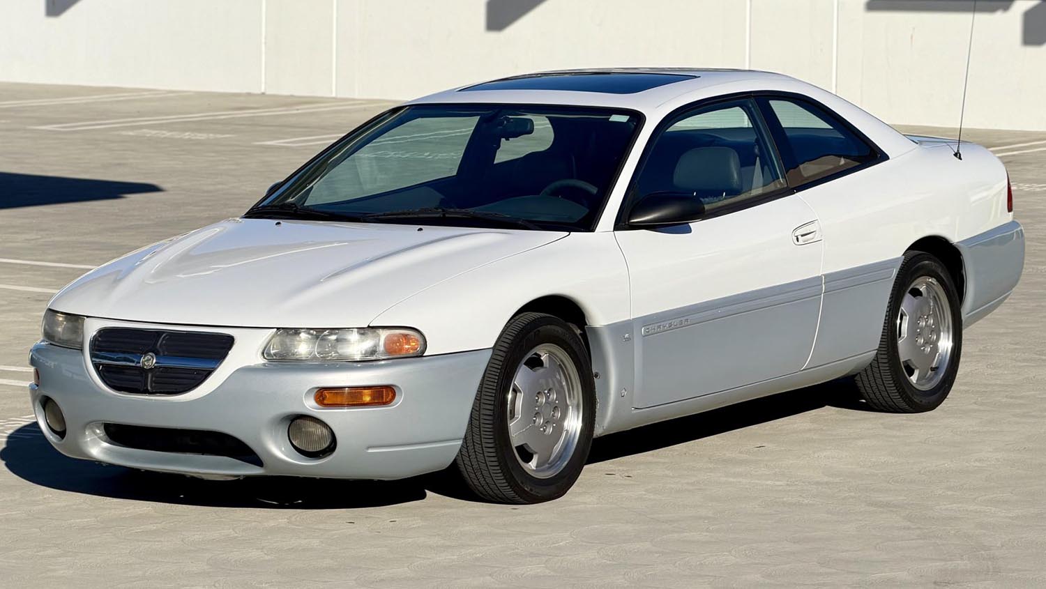The 1996 Chrysler Sebring LXi features a sleek profile finished in a classic white and silver two-tone scheme. Design elements include factory fog lights and a power sunroof that remains a focal point of the roofline. Minor details like the black mirror caps provide a sharp contrast to the bright white paint. While many of these coupes fell victim to harsh weather, this California car has avoided significant corrosion. The body panels appear straight and reflect the care of long-term ownership.