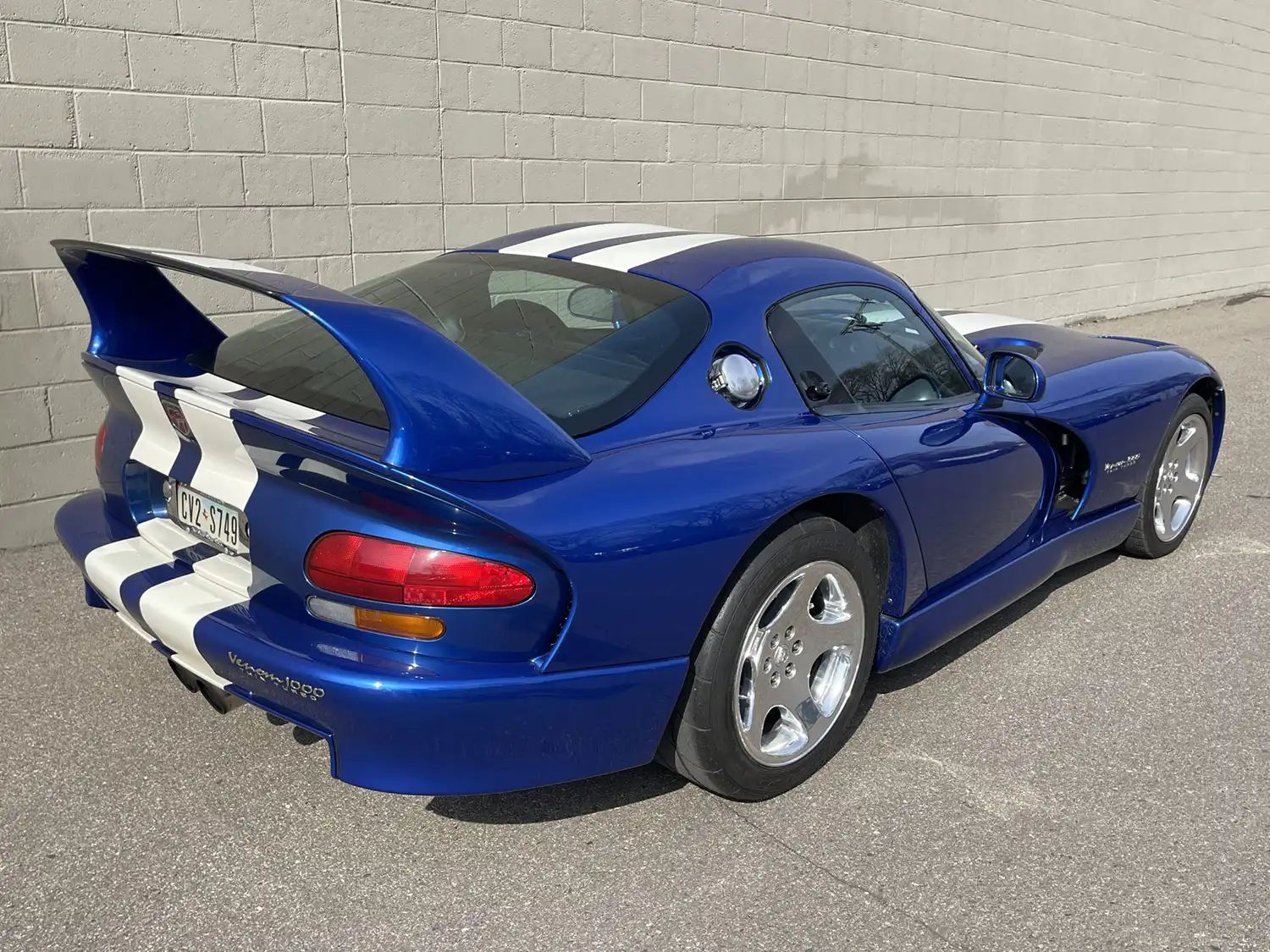 Performance-Oriented Interior: The interior of this Viper GTS features bucket seats upholstered in black leather with striking blue inserts, a color scheme that is carried over to the dashboard, center console, and door panels, creating a cohesive and sporty environment. Blue racing harnesses have been installed, emphasizing the car’s performance potential and providing added security for spirited driving. An Alpine CD stereo offers entertainment. The cabin also retains factory features such as air conditioning, power windows, and dual airbags for comfort and safety. Chrome accents add a touch of visual flair to the interior.