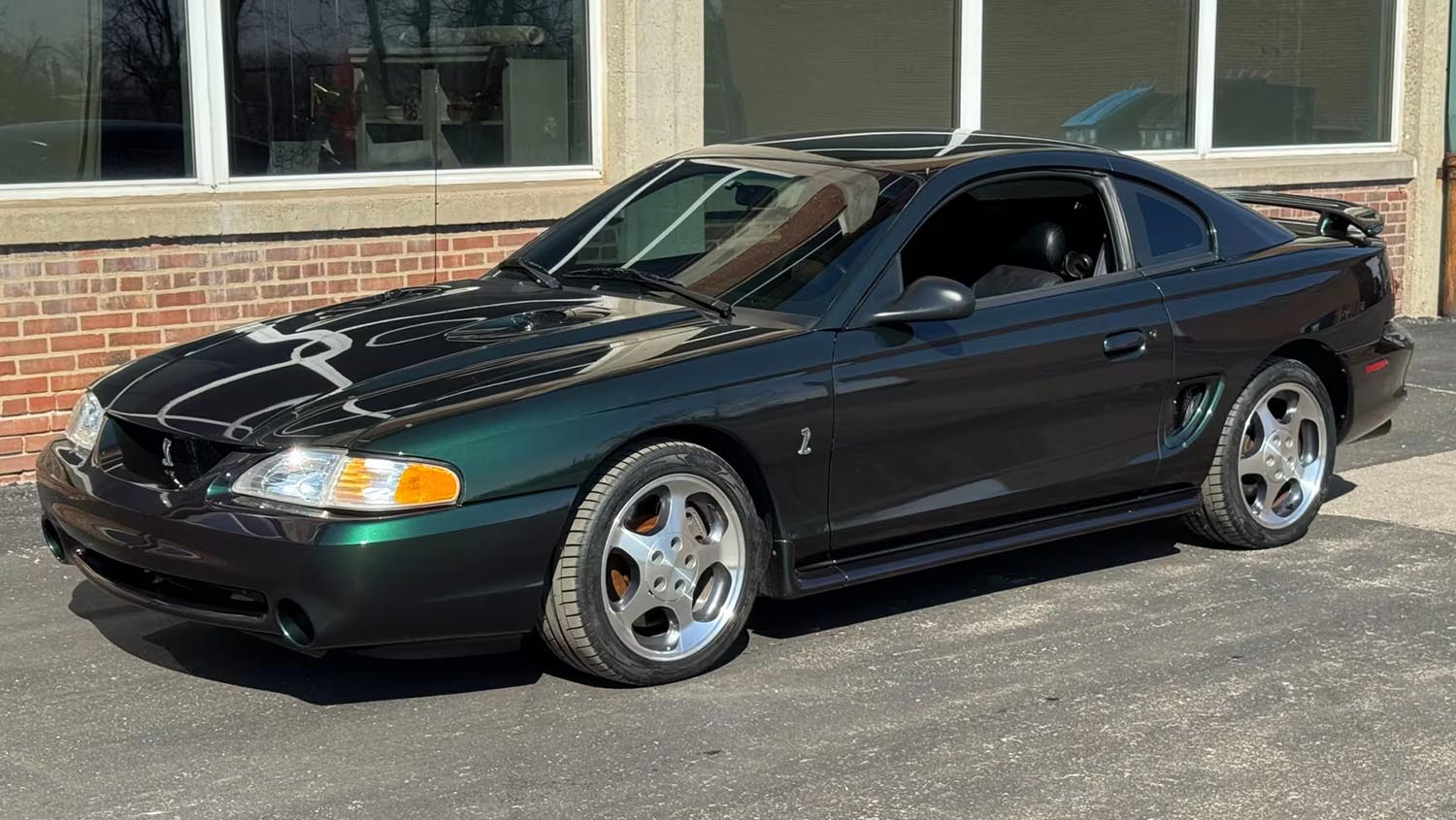 The exterior of this 1996 Ford Mustang SVT Cobra is defined by its stunning Mystic paint, a factory finish that shifts through shades of green, purple, and gold depending on the light. Its visual character is further enhanced by the Cobra-specific front fascia, unique circular fog lamps, and a rear spoiler that separates it from the standard GT models. The silhouette is anchored by original 17-inch alloy wheels, which house the performance-tuned suspension that was a hallmark of the SVT division. Every line of the SN95 body is accentuated by this rare paint technology, ensuring the car remains a standout piece in any collection. It is a functional design that prioritize cooling for the high-revving modular V-8 while maintaining a menacing, broad-shouldered stance.