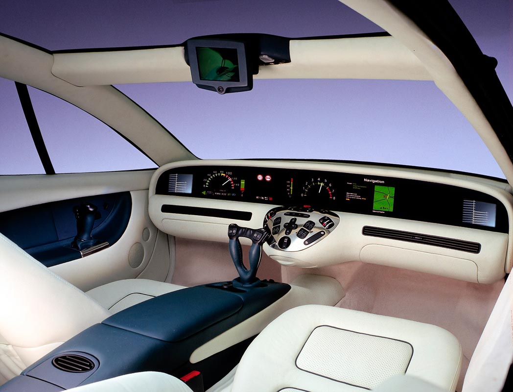 The display system in the F 200 Imagination may not officially have been called the widescreen cockpit in 1996, but the similarity to today’s Mercedes-Benz interior fittings and to MBUX is striking: colour monitors were mounted across the entire width of the cockpit. They displayed the vehicle instruments and all the notifications as well as the on-board computer. The displays also showed the signals from the video cameras that were fitted in place of inside rear-view mirrors – “rear-view systems” is what the press information called them. The telephone, navigation system, radio, CD and DVD players were displayed on the monitors. Sound was transmitted to wireless headphones for the front passenger if desired. The level of computerisation in this concept car was significant: even connection to the Internet including telebanking (as it was called at the time) and digital hotel reservations were tested: with the F 200 Imagination, the future came one step closer in 1996.