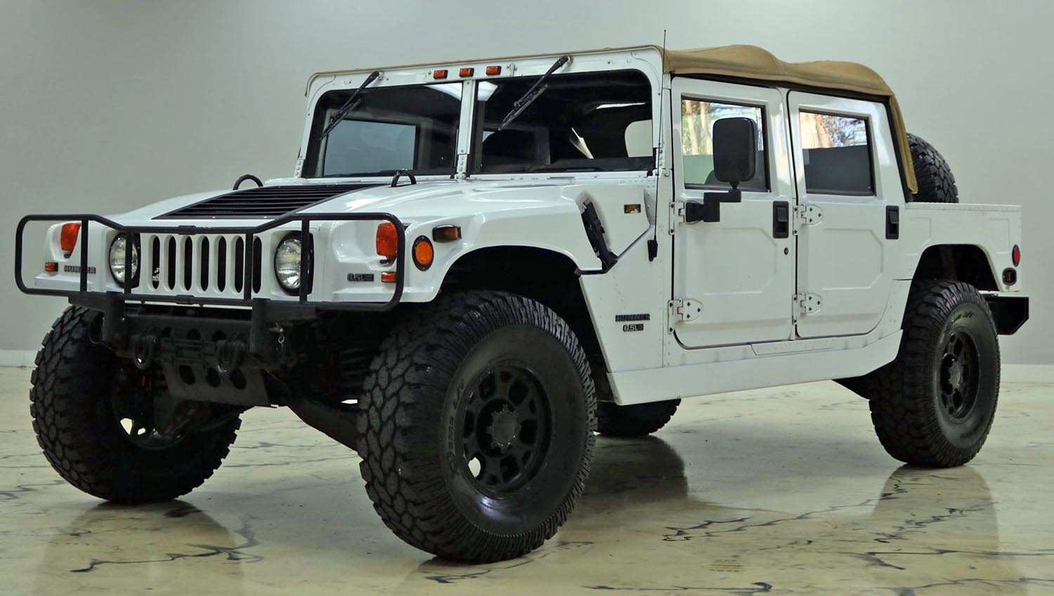 The exterior visual character of this Hummer is defined by its purposeful, boxy silhouette and heavy-duty protective equipment. The clamshell fiberglass hood and split windshield provide the classic H1 look, while a front brush guard and steel bumpers with recovery points ensure it is ready for the most demanding environments. Functional upgrades include 17-inch Vision Raptor wheels finished in matte black, which are paired with 37-inch Pro Comp Xtreme A/T tires for superior ground clearance. A spray-in bedliner has been applied to the rear cargo area, and the inclusion of a receiver hitch and window tint film adds modern practicality to this go-anywhere machine.