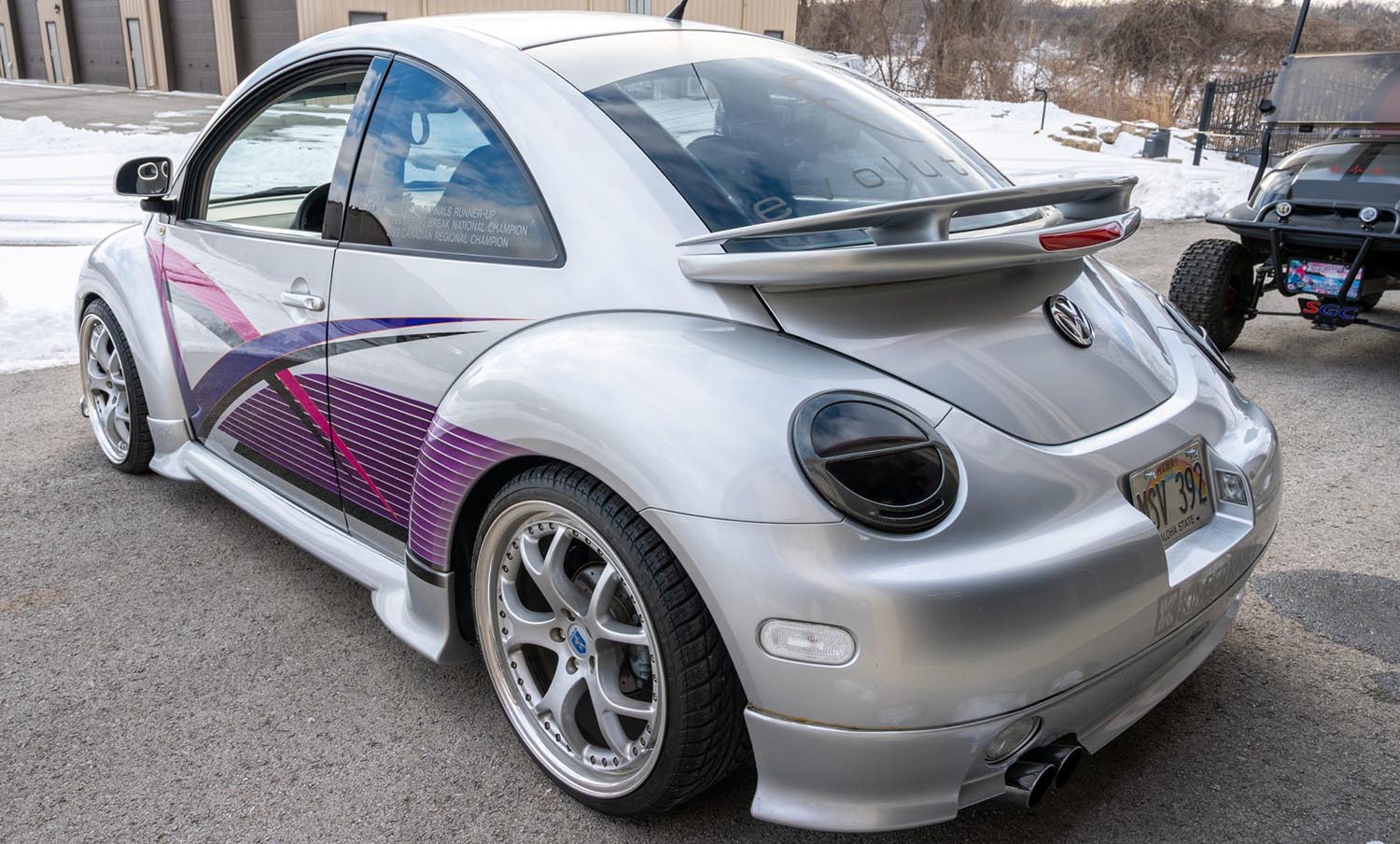 Finding a 1998 Volkswagen New Beetle 5-Speed with only 10k miles is a rare event. This specific silver example serves as a rolling museum of the late 1990s car culture scene. It spent its early years winning major audio competitions across the country.