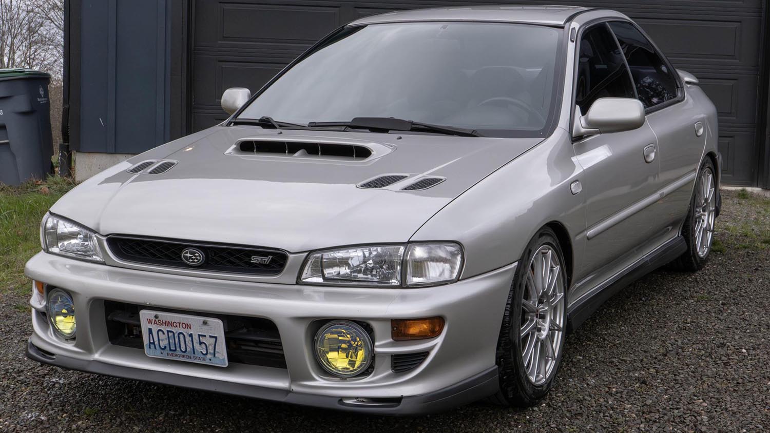 The Silverthorn Metallic finish remains a signature look for early millennium Subarus. A vented hood and a prominent rear wing define the aggressive silhouette of this 2.5RS. Up front, JDM fog lights provide a more authentic rally appearance compared to the stock US-spec units. An iWire hood scoop splitter was added to direct airflow more efficiently toward the top-mount intercooler. While the car shows some rock chips and scuffs from road use, it retains its iconic sport sedan aesthetic. The inclusion of 17-inch STi wheels further elevates the presence of the car. These wheels provide a wider footprint for better grip during spirited driving maneuvers.