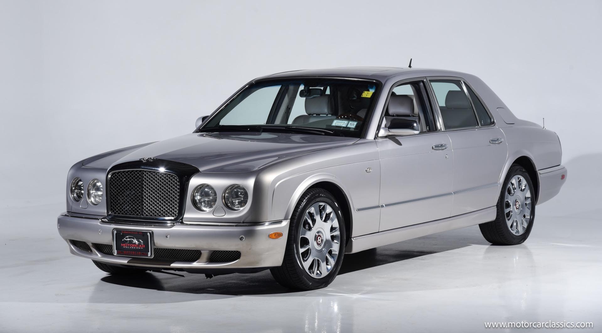 The exterior of this 2005 Bentley Arnage R is finished in the sophisticated and understated Silver Storm paint. This shade perfectly highlights the car’s imposing proportions and classic upright radiator shell. Polished aluminum alloy wheels add a touch of brightness to the side profile without appearing overly aggressive. Every body panel reflects the careful hand-finishing that defined Bentley’s production process during this transitional period. Auto-dimming side mirrors and intermittent wipers provide modern convenience while maintaining the car’s clean, timeless lines. This sedan commands attention through subtle elegance rather than flashy design trends. It is a car that looks at home at the most exclusive addresses.