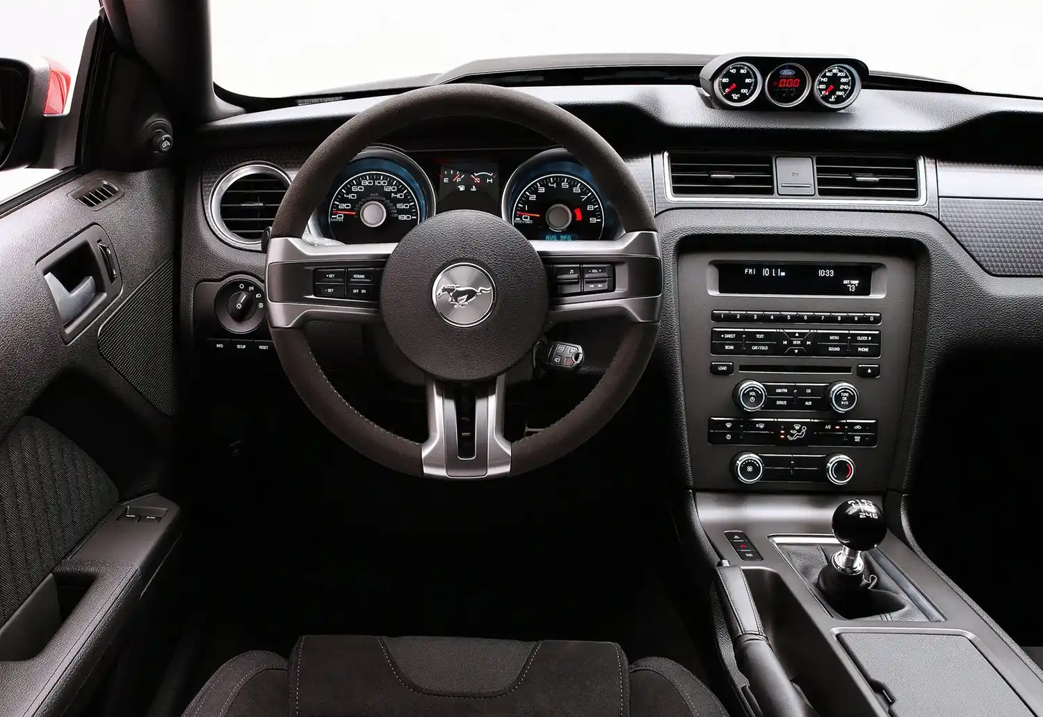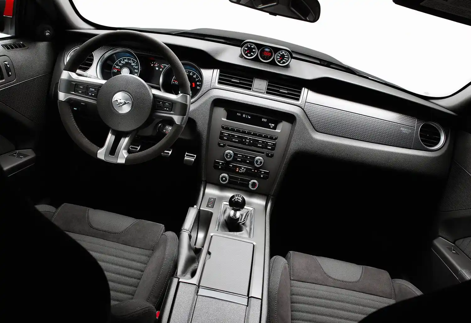 Standard Recaro front seats were designed by Ford SVT in cooperation with Recaro for high performance Mustang models, and are shared between the Boss and GT500. An Alcantara-covered race steering wheel provides a solid grip for hard cornering.