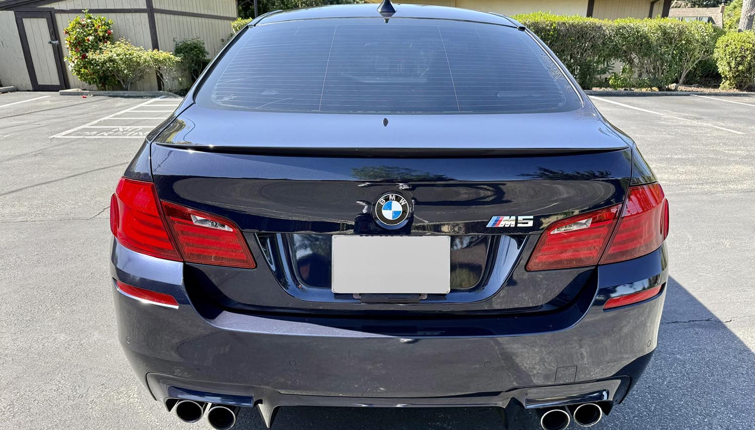 The exterior of this F10 M5 is finished in Imperial Blue Metallic, a deep hue that accentuates the deeper valances and sculpted side skirts exclusive to the M division. Unlike the standard 5-Series, the M5 features wide cooling ducts and a quad-exit exhaust system that hints at the power beneath the hood. Notable equipment includes adaptive xenon headlights, a power-operated trunk lid, and Shadowline trim that deletes traditional chrome for a more focused appearance. The body has been treated with a professional ceramic coating to preserve the paint’s depth. It sits perfectly on 20-inch Style 343M alloy wheels wrapped in staggered Michelin Pilot Super Sport tires, ensuring maximum grip for its rear-wheel-drive platform.