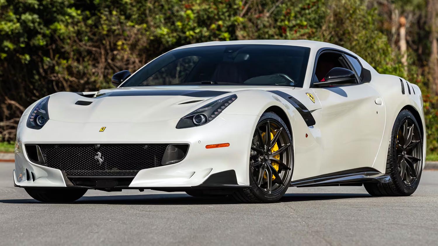 The exterior of the 2017 Ferrari F12tdf is a masterclass in aerodynamic efficiency and high-end personalization. Its White paintwork serves as a clean canvas for the historic GTO livery, adding significant character. Exposed carbon fiber trim pieces are visible across the body, reducing weight while enhancing the car’s menacing look. Yellow calipers provide a bright pop of color behind the wheels, clamping down on massive carbon ceramic brakes. Titanium exhaust pipes exit at the rear, promising a soundtrack that is nothing short of operatic. Furthermore, the suspension lifter ensures this low-slung exotic can navigate modern roads with relative ease. It is a striking visual package that honors Ferrari tradition while pushing modern design boundaries.