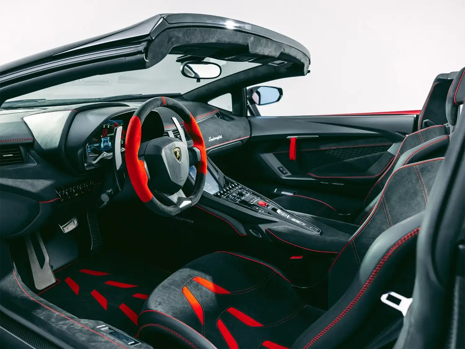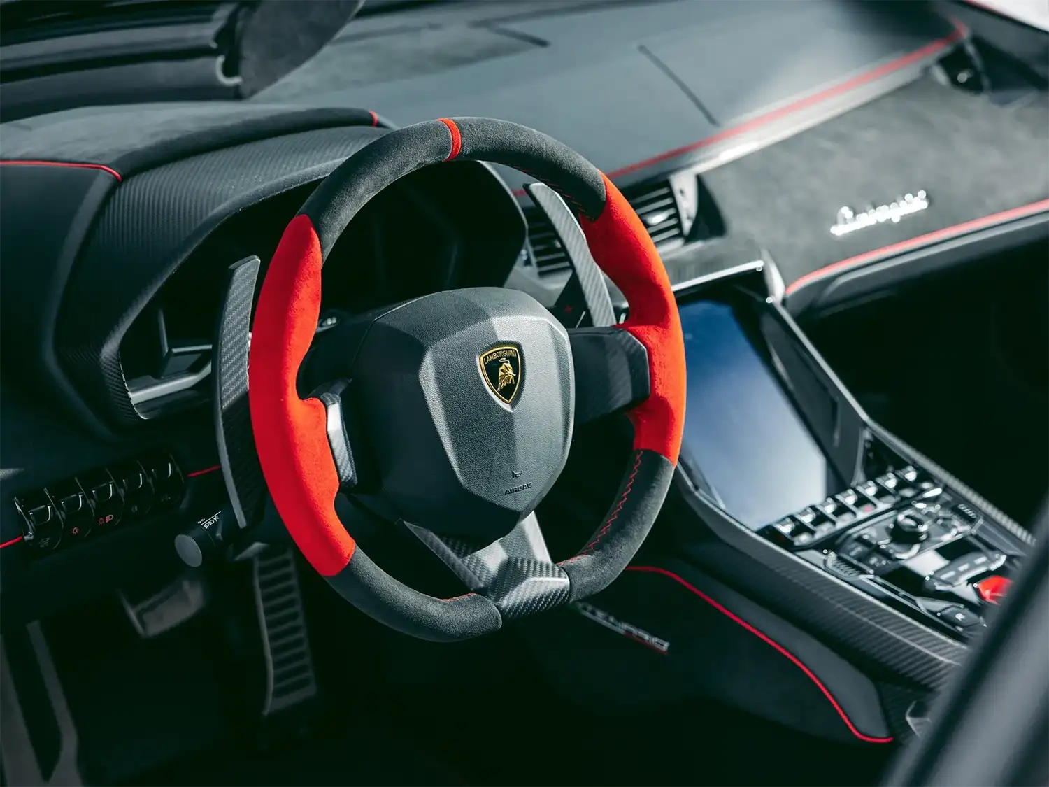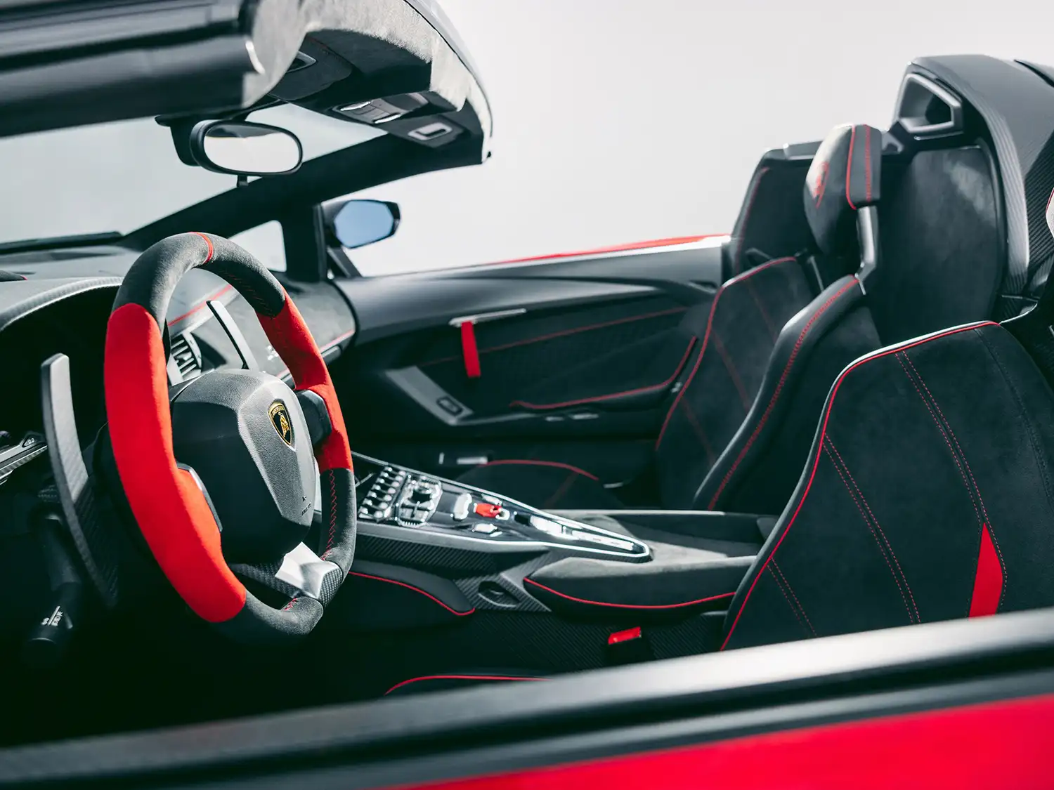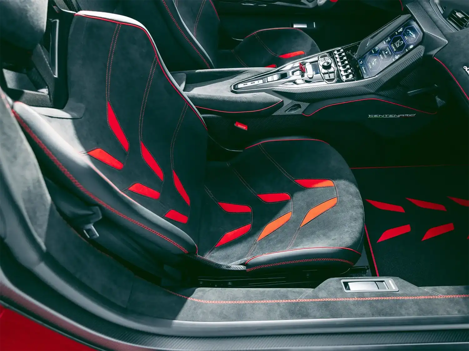 However, it was perhaps in its geometry that the Centenario deviated most significantly from previous Sant’Agata practice, for it became the first Lamborghini ever to be fitted with rear-wheel steering. The system effectively lengthened or shortened the wheelbase by as much as 1,200 millimetres, depending on any given situation, thereby improving manoeuvrability during urban driving and further increasing stability at high speed. Finally, the Centenario also set new standards for the marque in terms of its cockpit functionality and connectivity. A centre console-mounted 25 centimetre portrait screen not only operated as a conventional navigation and entertainment interface, but also offered telemetry, data-logging and lap timing facilities.