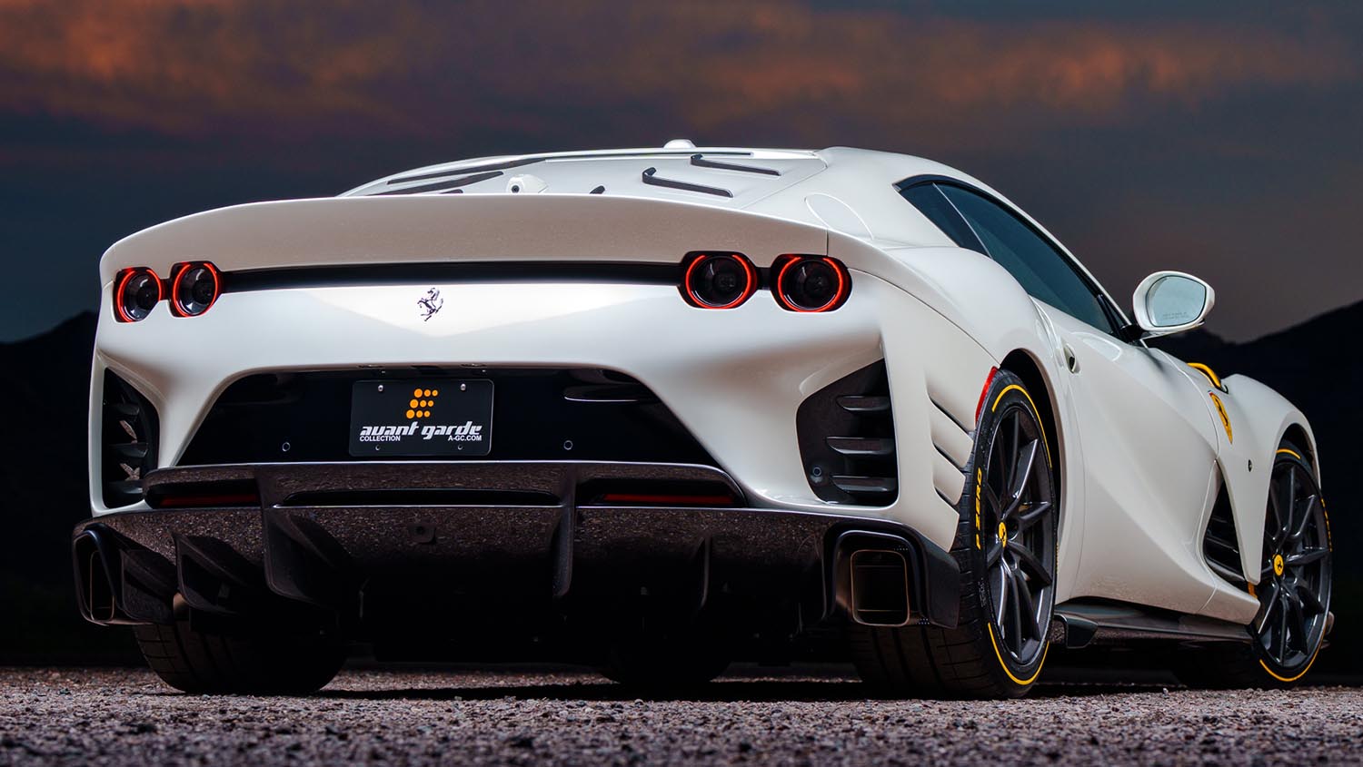 The use of carbon fiber is extensive, confirming the car’s dedication to lightweight performance. Carbon-fiber elements include the front spoiler, side mirrors, side skirts, and rear diffuser. Additional exterior details include adaptive LED headlights and airbrushed Scuderia Ferrari fender shields. For practicality, the car is fitted with both front and rear cameras and parking sensors. The overall effect is both aggressive and elegantly streamlined.