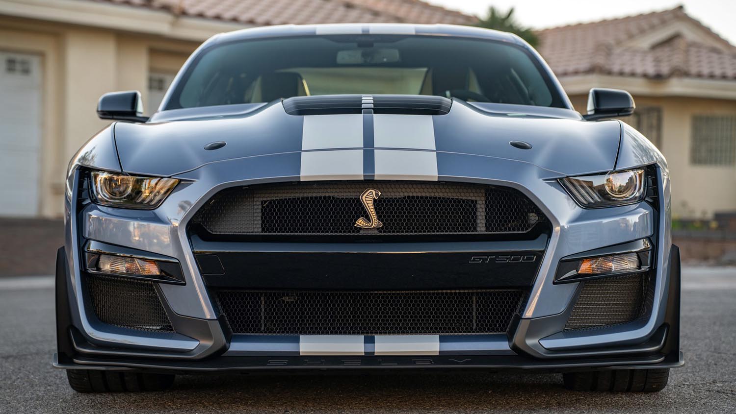 The visual character of the Heritage Edition is defined by its exclusive Brittany Blue Metallic paint, a color specifically chosen to evoke the spirit of the 1960s Shelbys. This example is further distinguished by Wimbledon White vinyl side and over-the-top stripes, providing a classic contrast to the modern, aggressive silhouette. Equipped with the Handling Package, the car features functional aerodynamic upgrades including splitter wickers and a rear Gurney flap. The louvered hood and HID headlights complement the 20-inch split-spoke wheels, which are wrapped in Michelin Pilot Sport 4 S tires to ensure the massive power is effectively translated to the road.