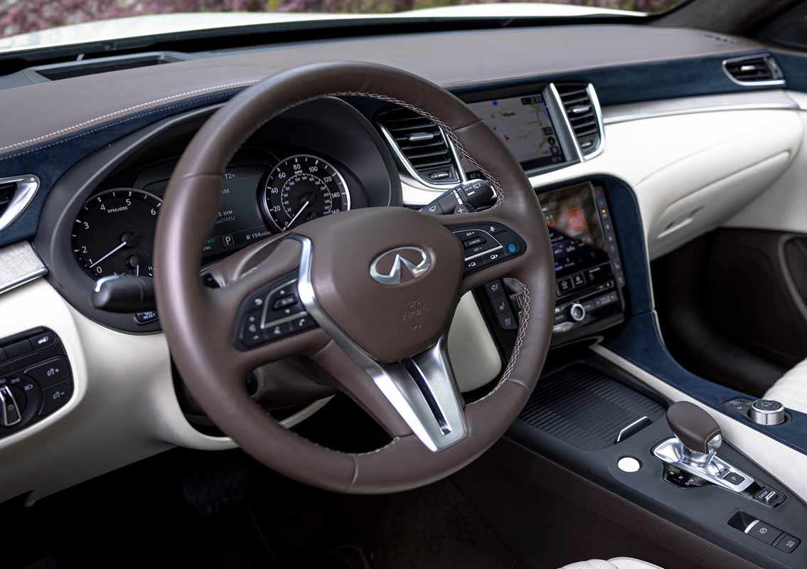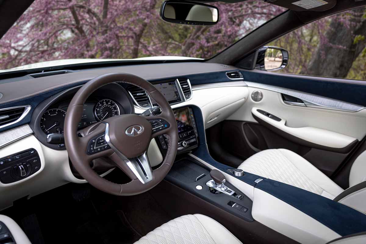 The interior of the QX50 is tastefully finished in one of three shades of leather- or leatherette-appointed seats: graphite, wheat, or white, with accompanying painted aluminum, aluminum, or natural open-pore maple wood trim accents.