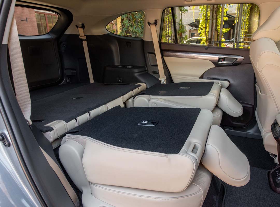 With all seat rows in use, Highlander offers 16.0 cu. ft. of carrying space behind the third row. Folding the 60/40 split fold-flat third-row seatbacks opens the space to 48.4 cu. ft., and then folding the second row raises that to 84.3 cu. ft. The versatile cargo area makes the most of its additional length with side surfaces and pockets shaped for maximum space usage.