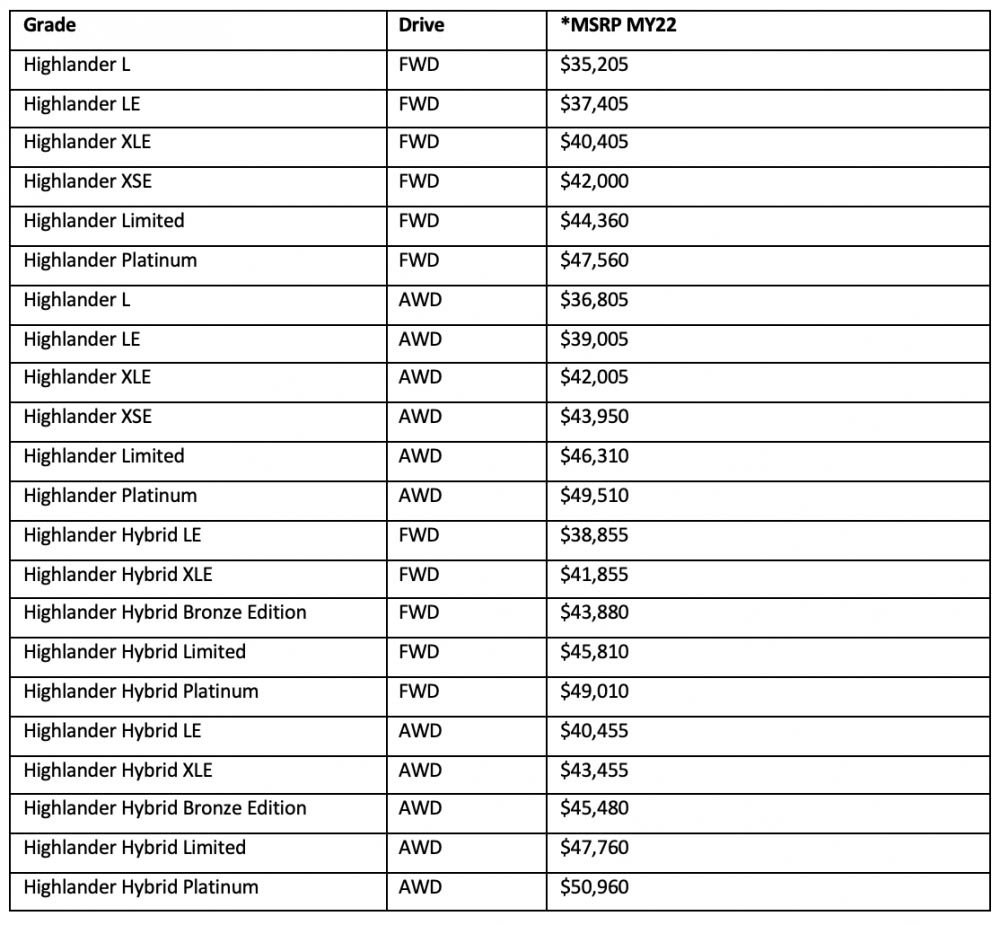 The Highlander Hybrid Bronze Edition is also a glimpse into new offerings for 2022 Highlander, overall. This includes Wind Chill Pearl now added to exterior color palate (replacing Blizzard Pearl) and the addition of /tilt power passenger seat adjustments, which will also be standard on 2022 Highlander XLE and above.