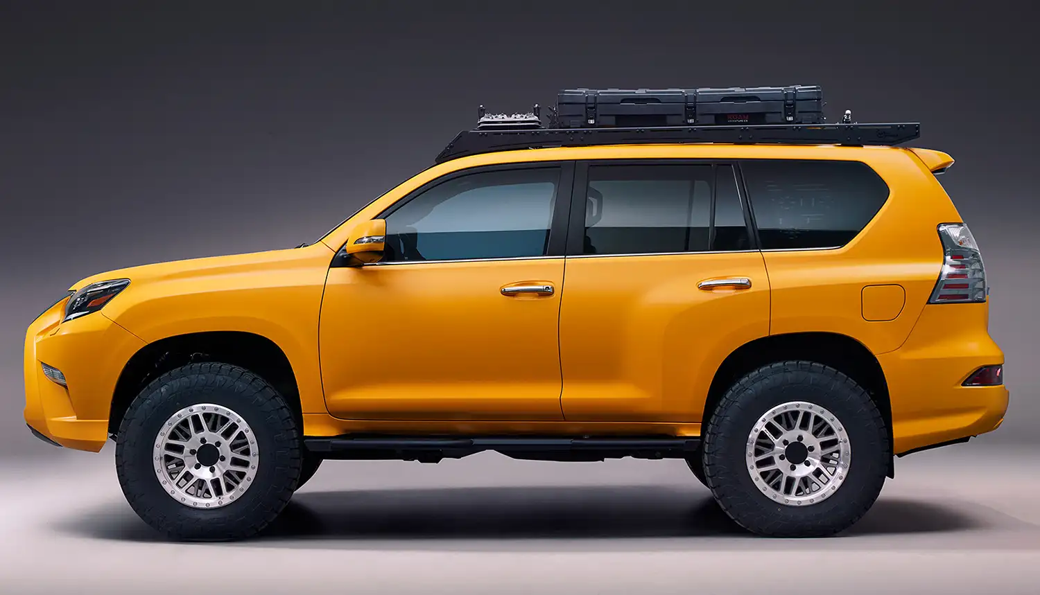 Shown in a custom Matte Yellow Saffron body wrap, this GX is equipped with 34-inch Toyo® Open Country A/T tires and 18-inch wheels. CBI Offroad rock sliders and a full skid plate assist the vehicle on rugged, off-road terrain.
