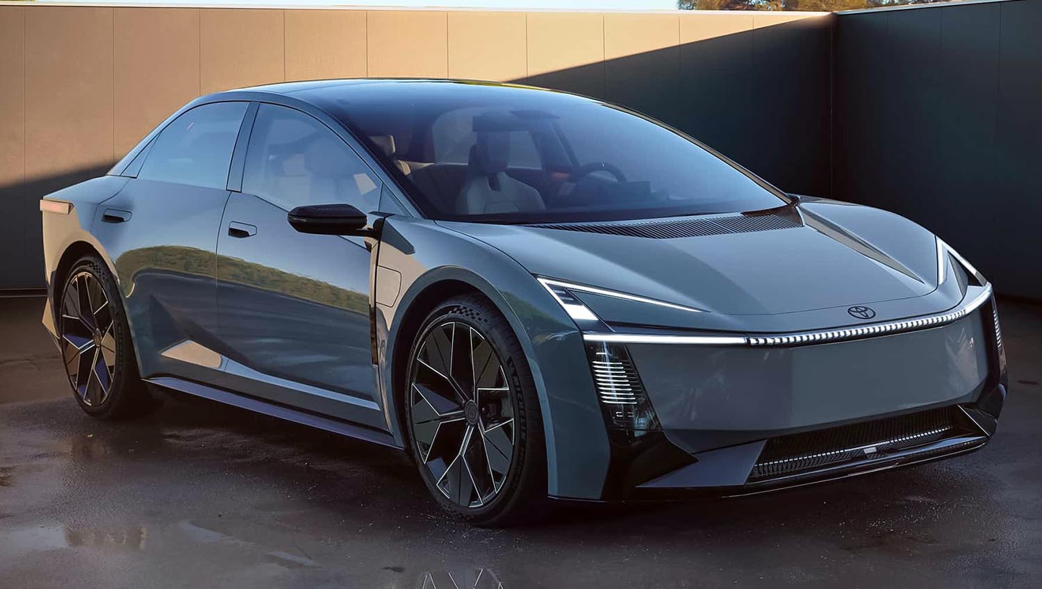 The concept showcases a sleek, edgy body that barely resembles the current Corolla. Smooth light bars run across the front and rear, while the integrated trunk spoiler emphasizes a sportier profile. Frameless doors and a sharply descending beltline toward the mirrors create a premium, futuristic aesthetic.
