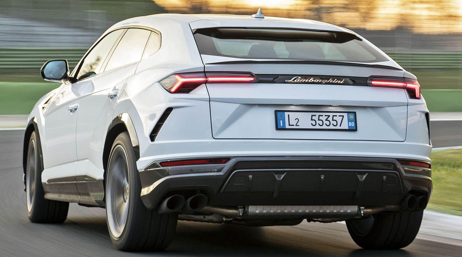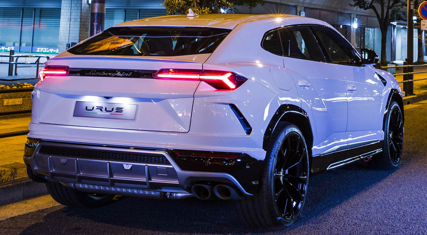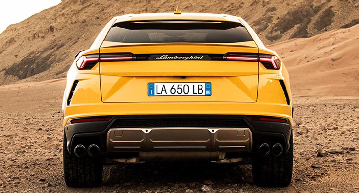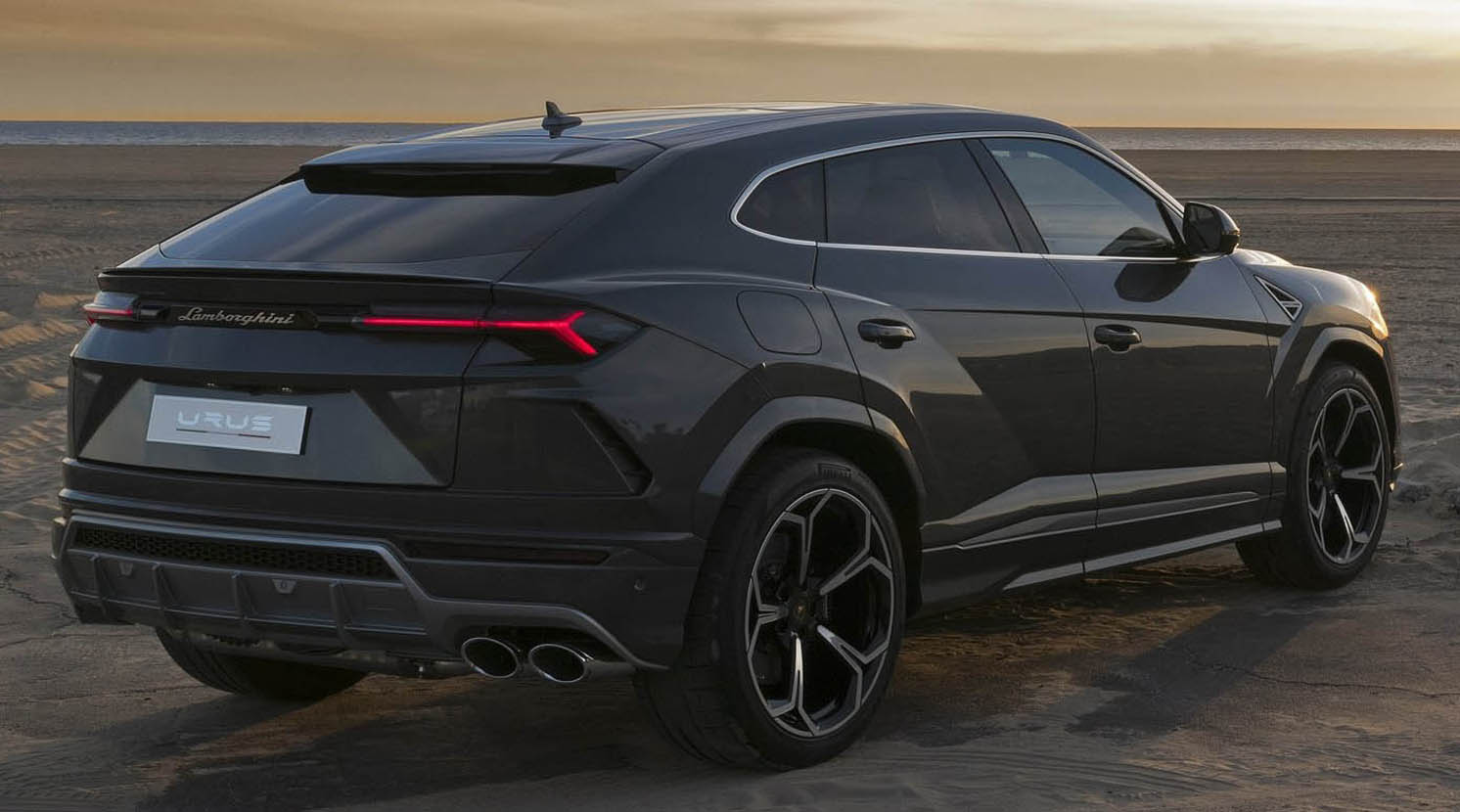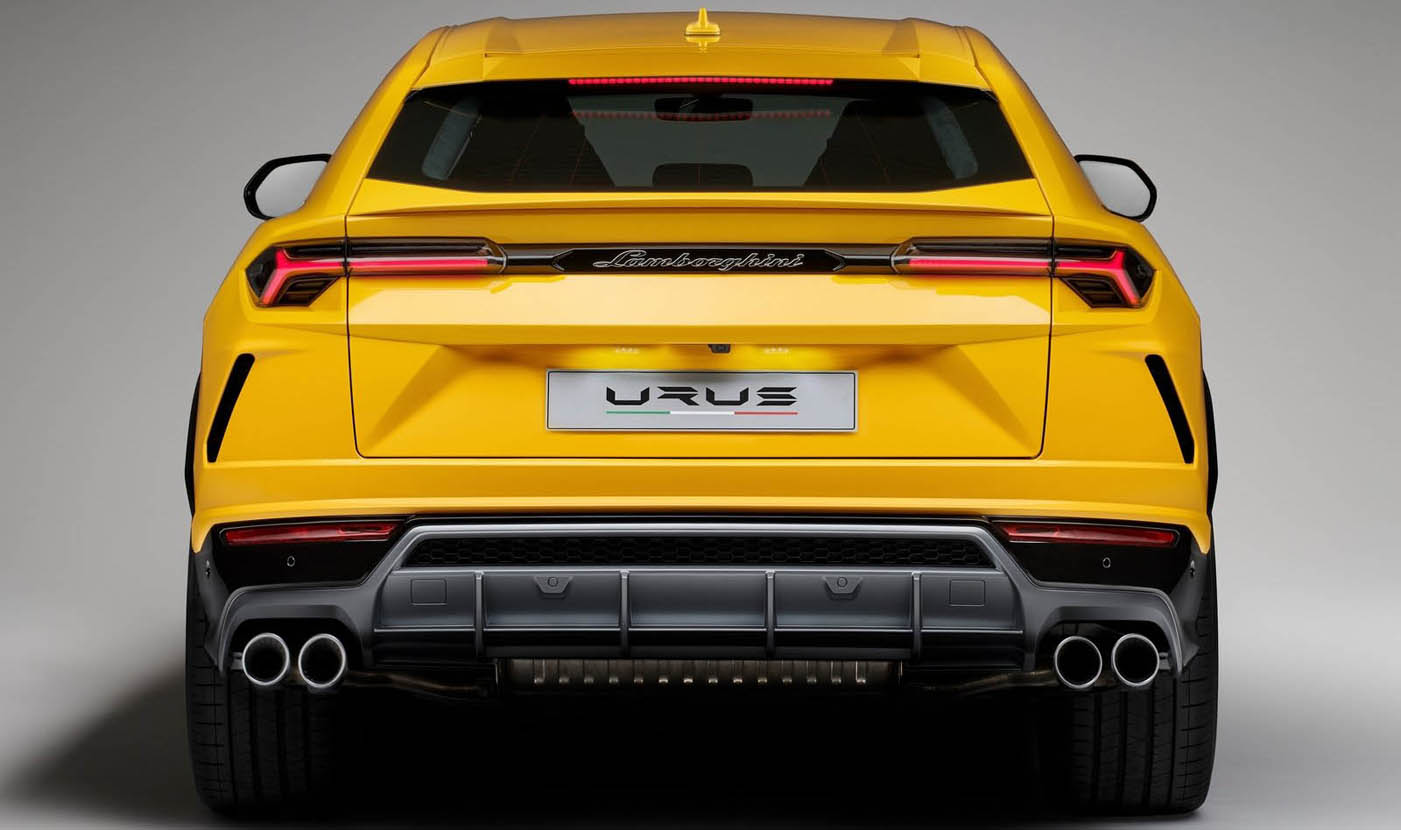 The rear of the Urus sports the complex, powerful lines typical of a Lamborghini, reinforcing the strong, planted character of the car. The roof line broadens at the base of the roof panel in the style of Lamborghini models including the Countach and Murciélago. The substantial rear shoulders support the strongly inclined rear windows, with the entire rear connected by the fender and concurrent black panel housing the air grilles, Lamborghini logo and the Y-shaped taillights. The rear diffuser is inspired by Lamborghini race cars, with integrated double round exhaust pipes.