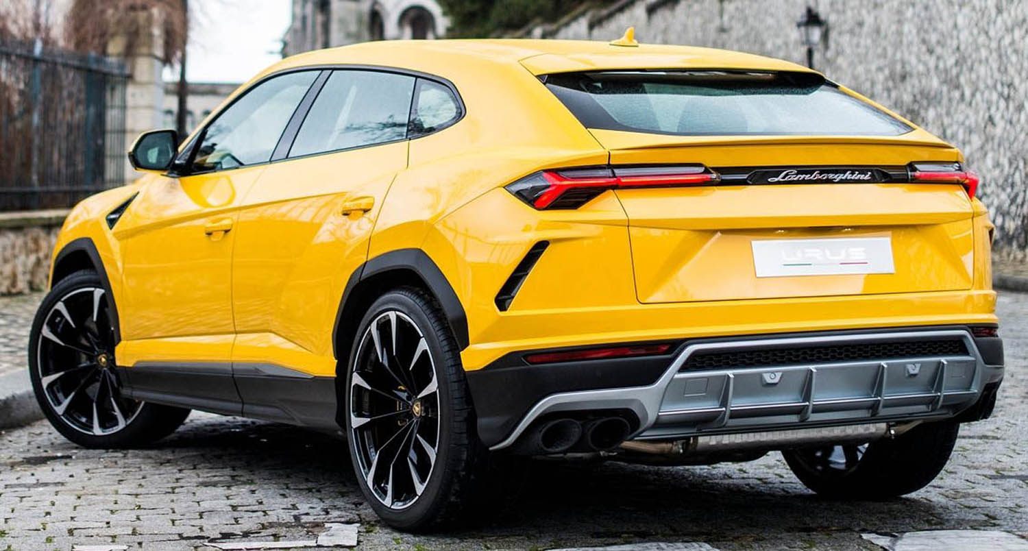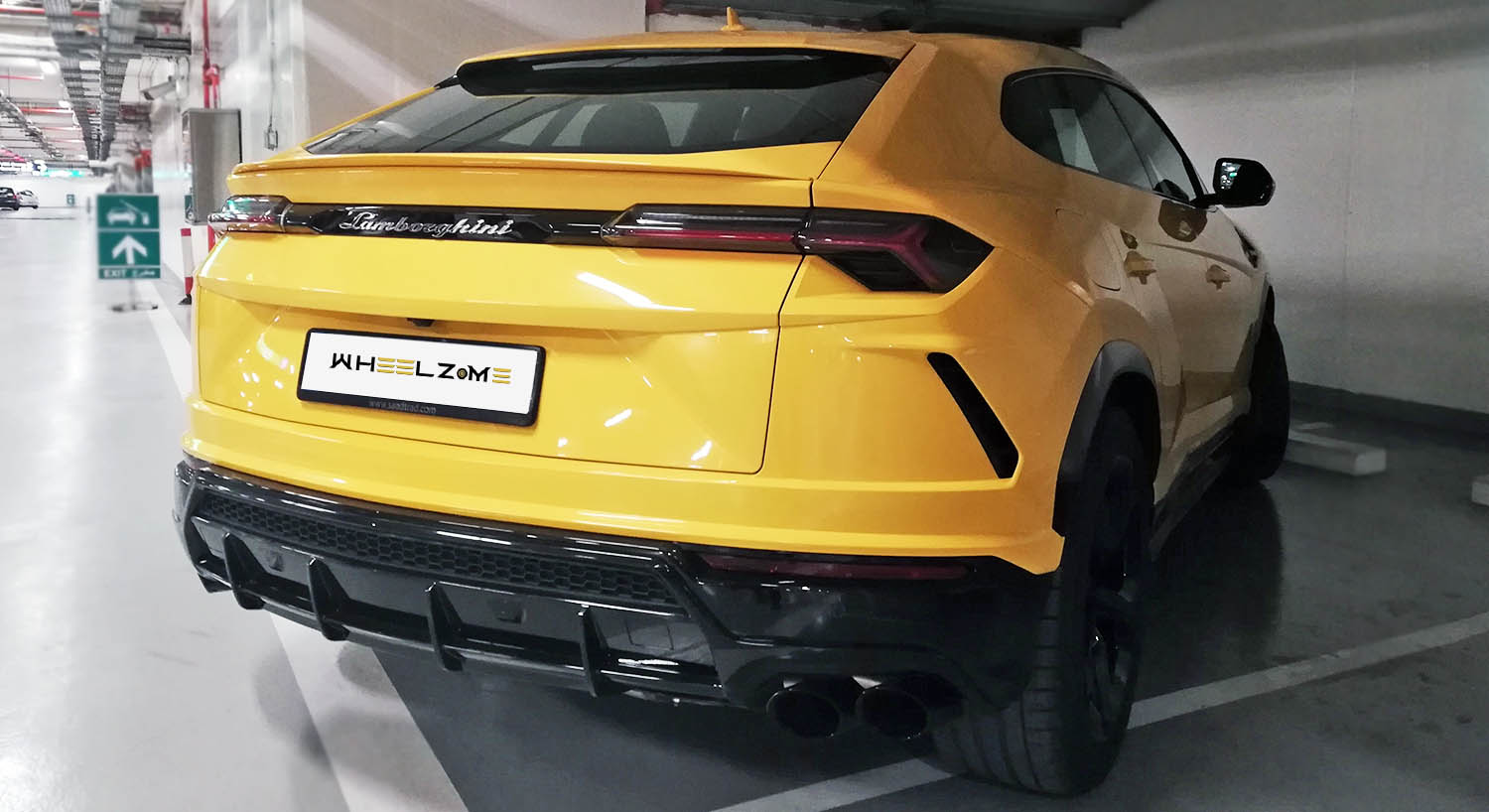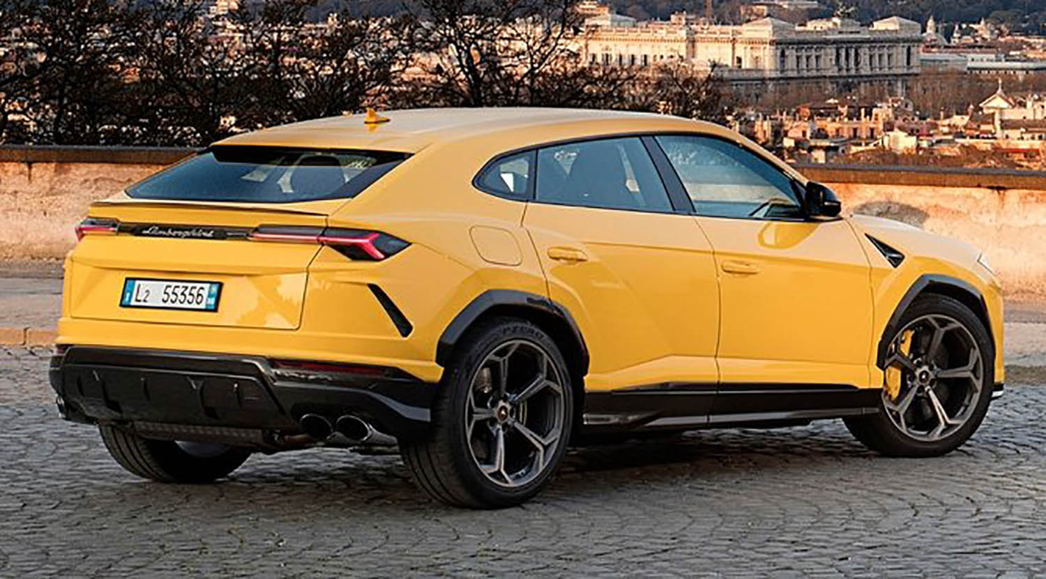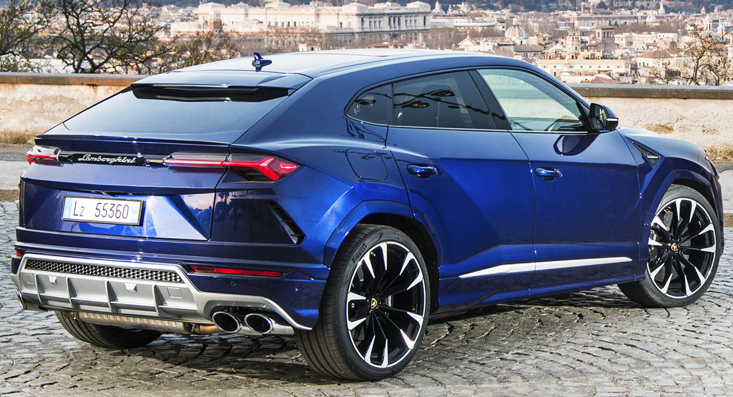 The rear of the Urus sports the complex, powerful lines typical of a Lamborghini, reinforcing the strong, planted character of the car. The roof line broadens at the base of the roof panel in the style of Lamborghini models including the Countach and Murciélago. The substantial rear shoulders support the strongly inclined rear windows, with the entire rear connected by the fender and concurrent black panel housing the air grilles, Lamborghini logo and the Y-shaped taillights. The rear diffuser is inspired by Lamborghini race cars, with integrated double round exhaust pipes.
