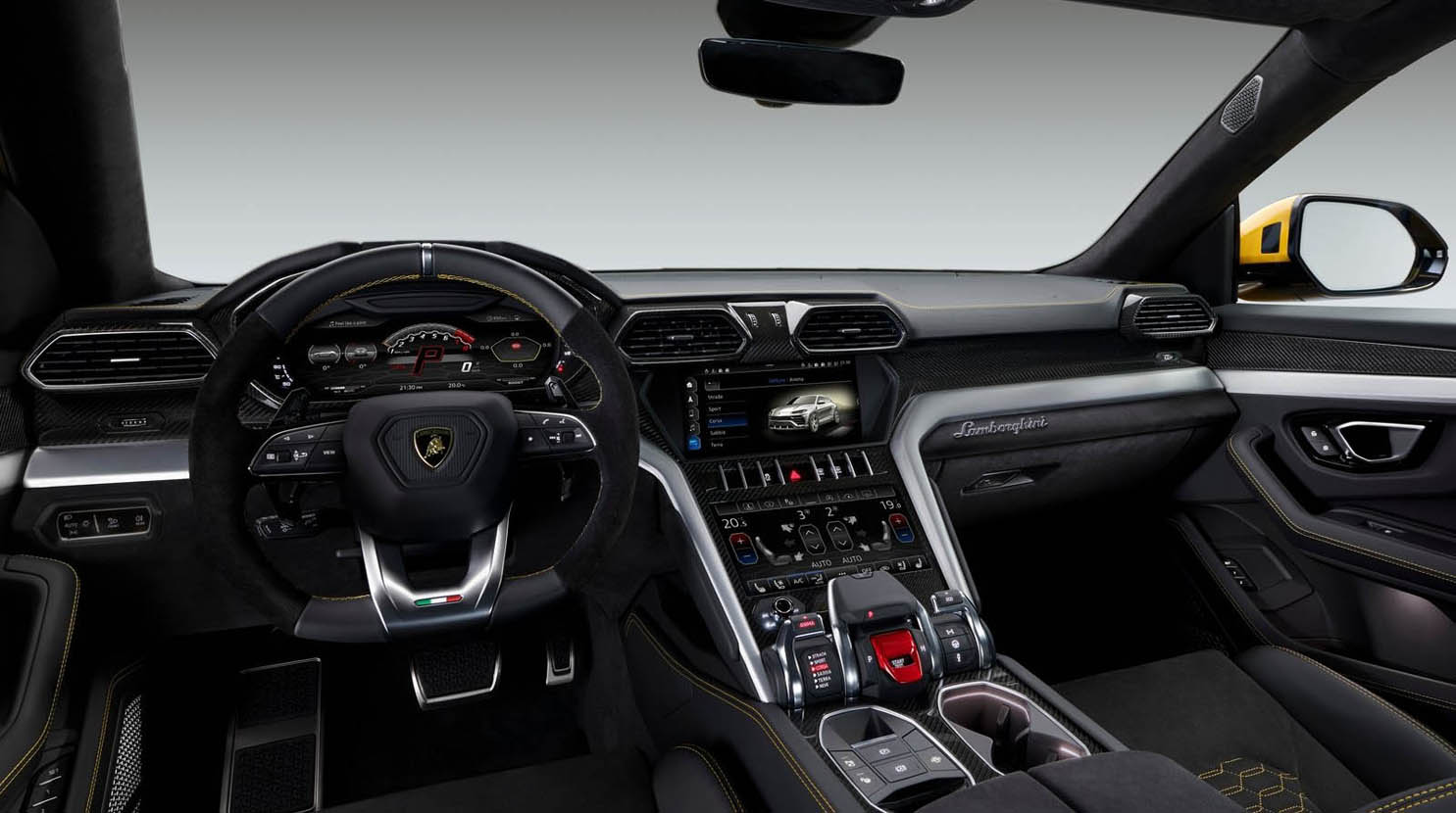 Internally the Urus is specified with a Unicolor leather and trim in either Nero Ade or Grigio Octans and five additional optional colors. Dual-color Bicolor Elegante and Bicolor Sportivo specifications with options of both leather and Alcantara are also available. Stitching options and complementary seat belt, floor mat and carpet colors allow clients to customize their Urus in a more sporty or elegant style as required. The dashboard trim is finished in Piano Black and Brushed Aluminum as standard. Optional finishes are offered in Open Pore wood including a combination with aluminum, and a carbon fiber alternative.