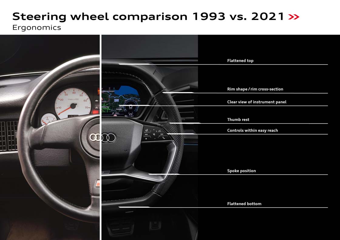 Today, Audi’s latest generation of steering wheels consists of a diecast frame that is significantly lighter than steel constructions and has other advantages with respect to strength, dampening characteristics, and castability. It offers up to 18 functions and capacitive grip recognition, which supports assisted steering interventions and has found its way into all Audi steering wheels.