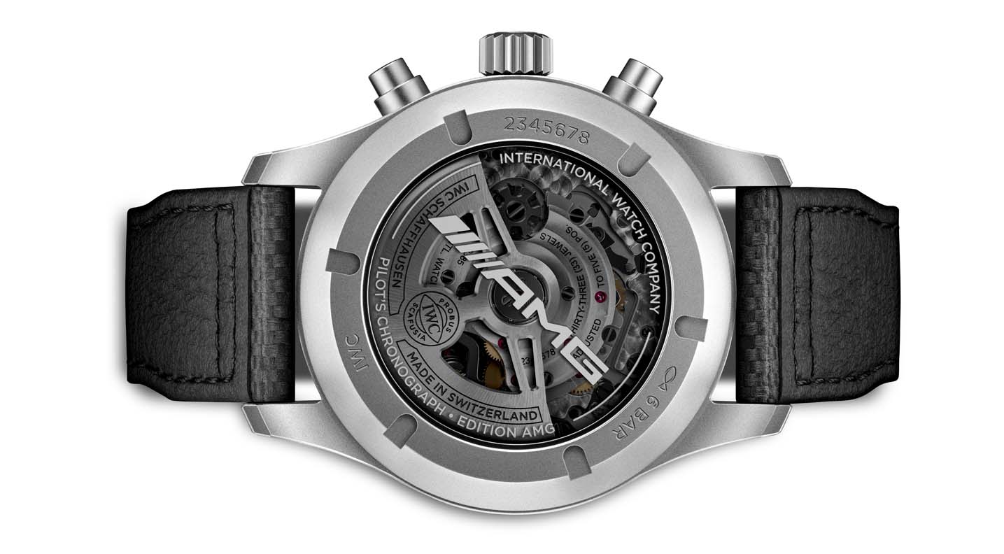 The all-around performance watch is powered by the IWC-manufactured calibre 69385, a robust and precise chronograph movement that enables stop time measurements of up to 12 hours. The chronograph function is controlled by a column wheel, an intricate component with two functional levels. The Mercedes-AMG logo is emblazoned on the tinted sapphire crystal case back. The timepiece is fitted with a black embossed calf leather strap with contrast stitching and folding clasp.