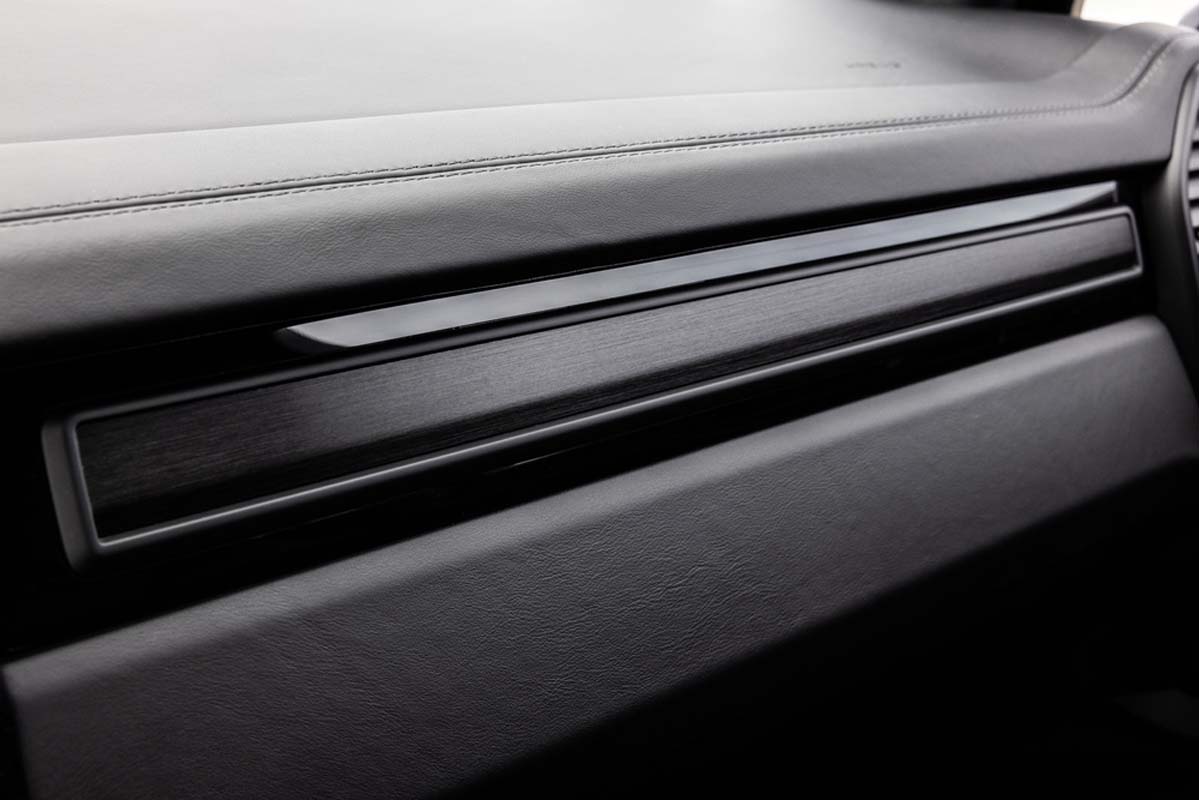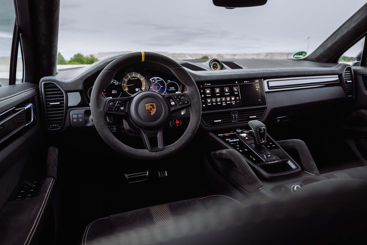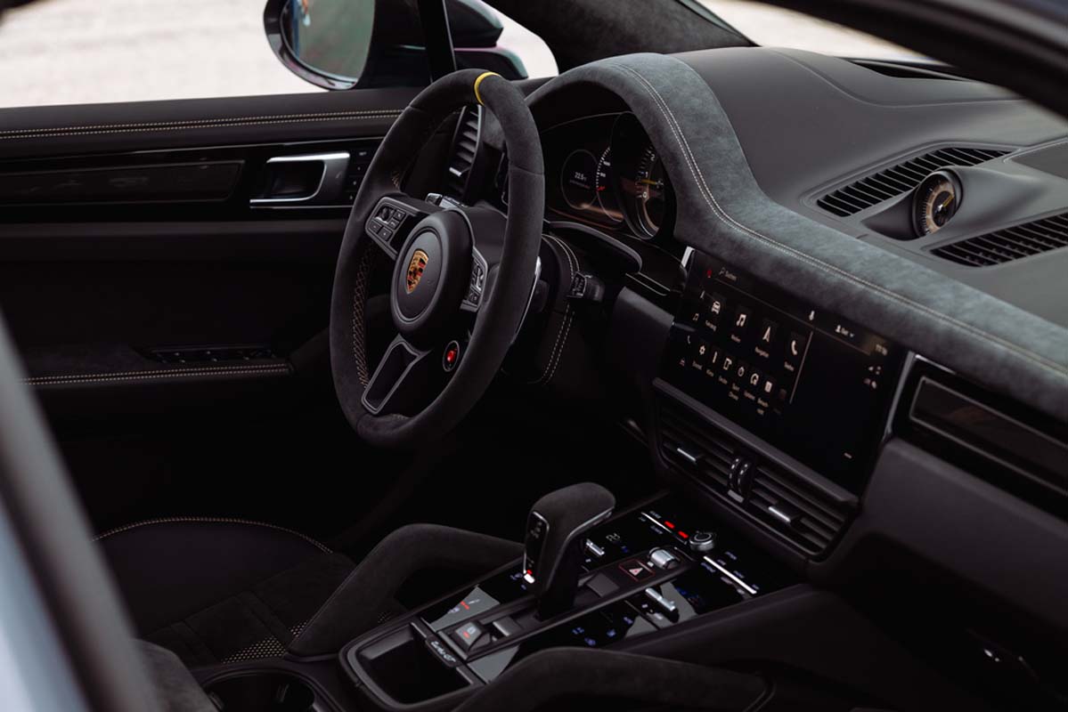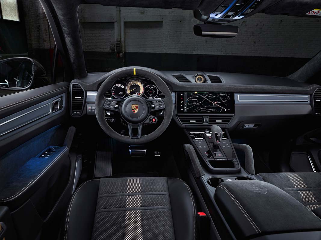The sporty character of the Cayenne Turbo GT is highlighted by the high-quality standard equipment and extended Alcantara features of its interior. Eight-way sport seats in the front and a sport rear seat system with two seats are standard. They feature perforated seat centre panels in Alcantara, contrast accents in Neodyme or Arctic Grey and ‘turbo GT’ lettering on their headrests. Typical for Porsche’s sports cars, the multifunction sports steering wheel has a yellow 12 o’clock marking. Depending on the specified trim, select accent strips are finished in matt Black.