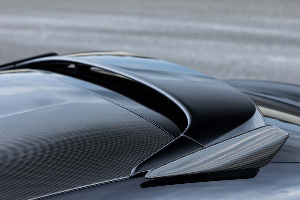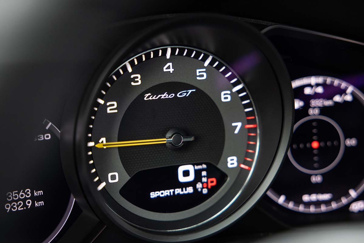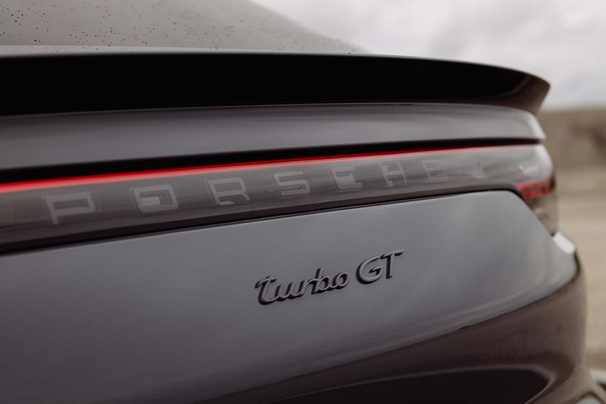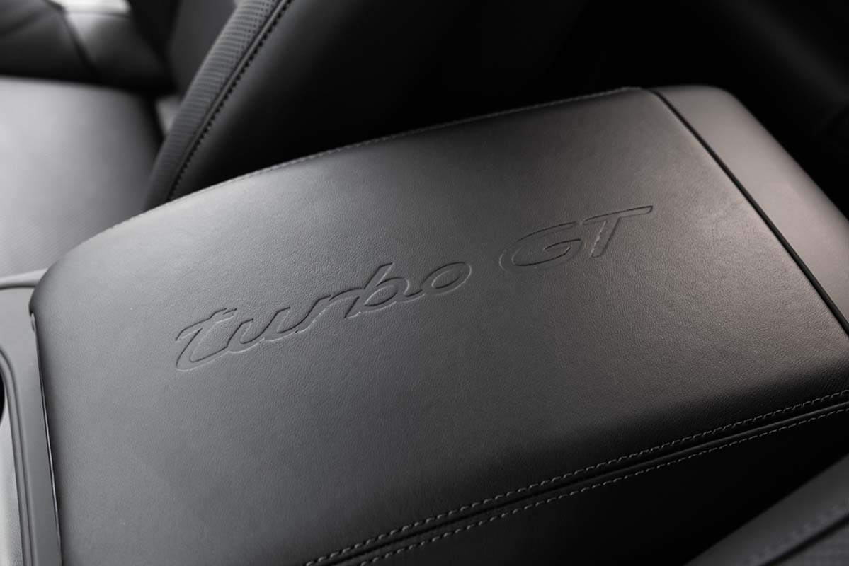 A contoured carbon roof and black wheel arch extensions, together with 22-inch GT Design wheels in Neodyme, dominate its side view. The carbon side plates fitted length-wise to the roof spoiler are GT-specific, as is the adaptively extendable rear spoiler’s lip, which is 25 mm larger than that fitted to the Turbo. This increases downforce at the car’s top speed by up to 40 kilograms. The rear view is rounded off by a striking diffuser panel made of carbon.