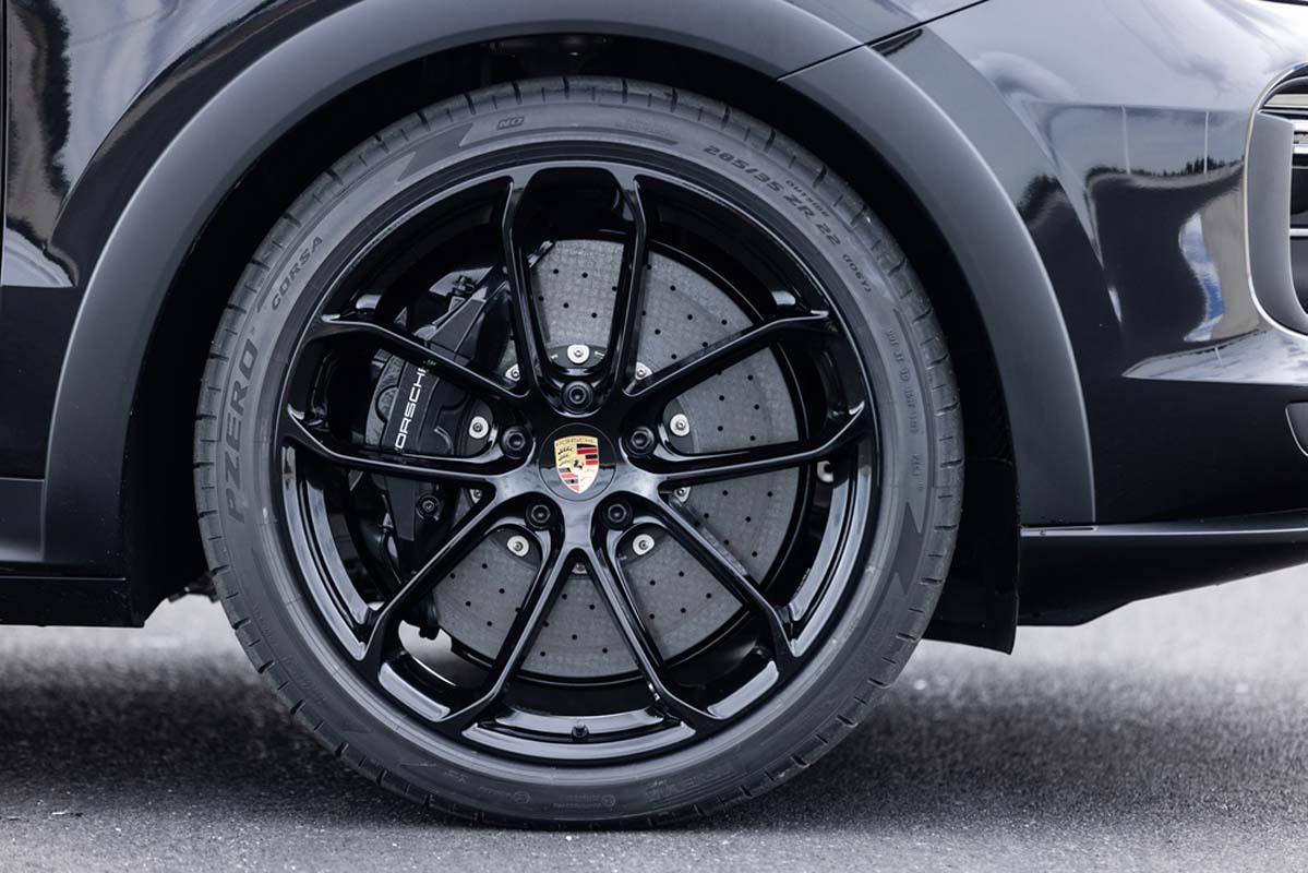 The result is even better roll stability and roadholding, as well as more precise turn-in behaviour at higher cornering speeds. In line with this, the Porsche Torque Vectoring system allows higher torque bias ratios. The comprehensively optimised front axle also improves handling. Compared to the Turbo Coupé, its front wheels are an inch wider and negative camber has been increased by 0.45 degrees to give the new 22-inch Pirelli P Zero Corsa performance tyres, specially developed for the Turbo GT, a larger contact patch. The Porsche Ceramic Composite Brake (PCCB) system is part of the standard equipment.