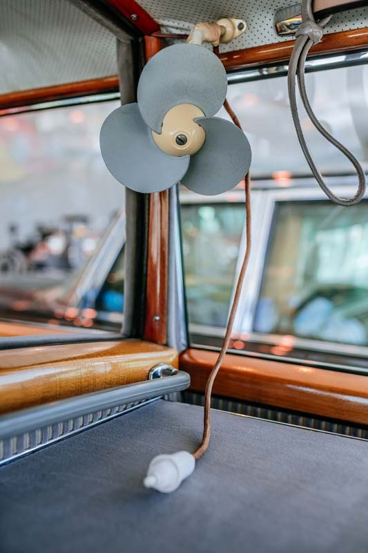 Working atmosphere: What must it be like in 2021 – a year in which a general election will be held in Germany – to take a seat in the rear, which, back in the day, formed part of the recently established Federal Republic’s centre of power? To this day, standard features of the prestigious vehicle, such as wood trims, still bear witness to the positioning of the Mercedes-Benz 300 as a luxury vehicle. However, Adenauer’s seat in the right rear also radiates a genuine working atmosphere: on the back of the divider, which features an electrically powered window pane, a small folding table is fitted that can be used for tasks such as analysing documents or going through the post. A roller blind operated by a cable pull was installed to obscure the rear window and protect occupants from sunlight, as the Chancellor’s vehicle did not feature air conditioning at the time. However, a three-vane fan was installed above the head of government’s seat to guarantee a refreshing breeze. The 1959 saloon’s communication technology was ultramodern: the glove box concealed an early version of an in-car phone.