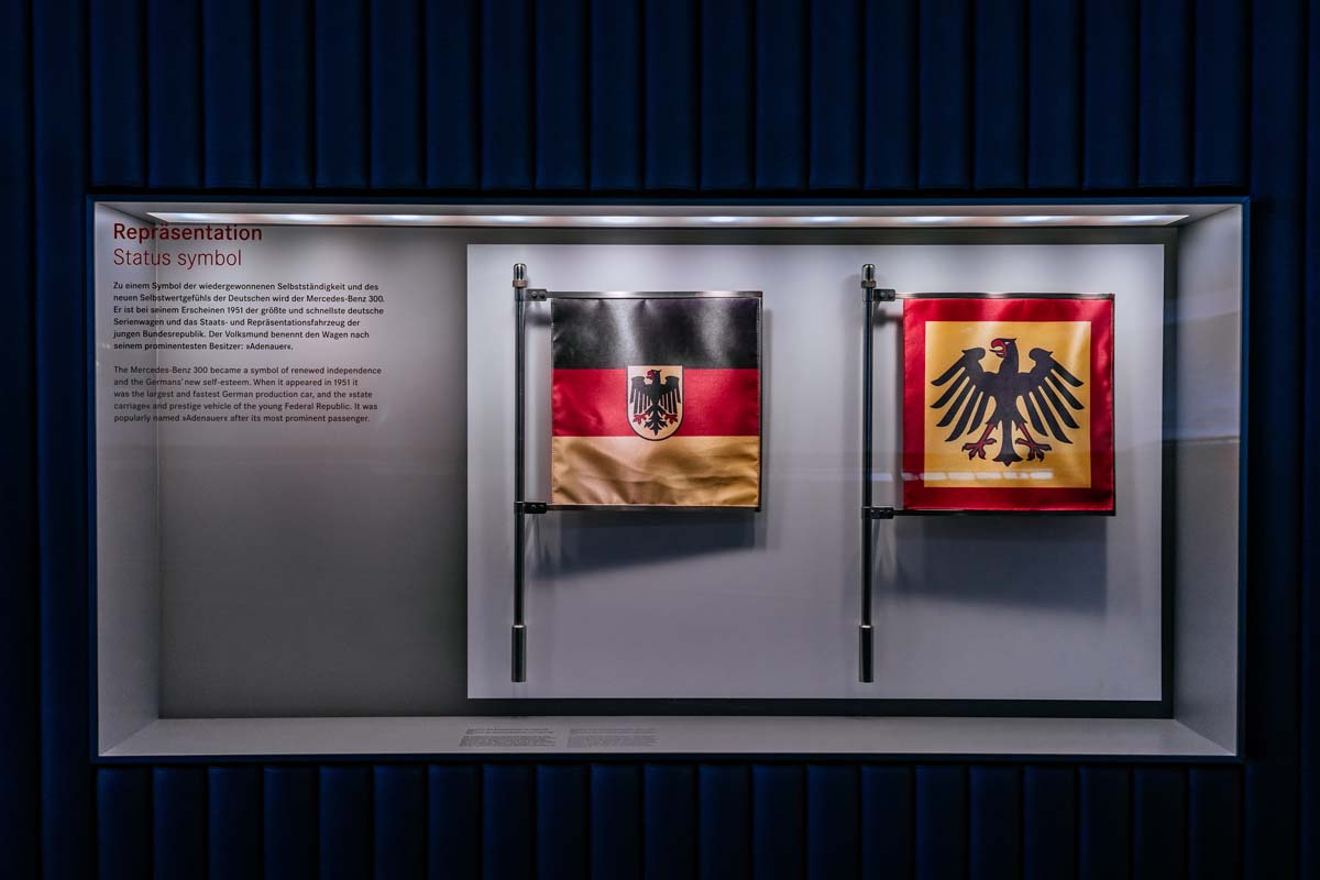 Prestigious saloon: On 15 September 1949, Germany’s parliament – the Bundestag – elected Christian-democratic and liberal-conservative politician Konrad Adenauer as the first Chancellor of the Federal Republic of Germany. Two years later, Adenauer then had to choose himself: at the International Motor Show (IAA) in Frankfurt/Main between 19 and 29 April 1951, the new prestigious Mercedes-Benz 300 (W 186) vehicle celebrated its premiere, attracting a great deal of attention in the process. The head of government attended the exhibition and spontaneously opted for the saloon by the Stuttgart-based brand as the new official vehicle. It was handed over on 8 December 1951 at Palais Schaumburg in Bonn, the headquarters of the Federal Chancellery at the time. The first ever Federal President of the Federal Republic of Germany, Theodor Heuss, also used a Mercedes-Benz 300 as his official vehicle. On official occasions, the vehicles bore 30 x 30-centimetre pennants on one of the wings. The Mercedes-Benz Museum showcases the Federal Chancellor’s pennant (“Bundesadler” eagle on black, red and gold background) and the Federal President of the Federal Republic of Germany’s pennant (“Bundesadler” eagle on gold background with red frame) in a display case as part of the historic tour in Legends 4: Post-war Miracle – Form and Diversity, 1945 to 1960. While Adenauer’s first Mercedes-Benz 300 official car featured two pennant holders in 1951, the 1959 vehicle on show at the Museum only features one holder on the right-hand wing.