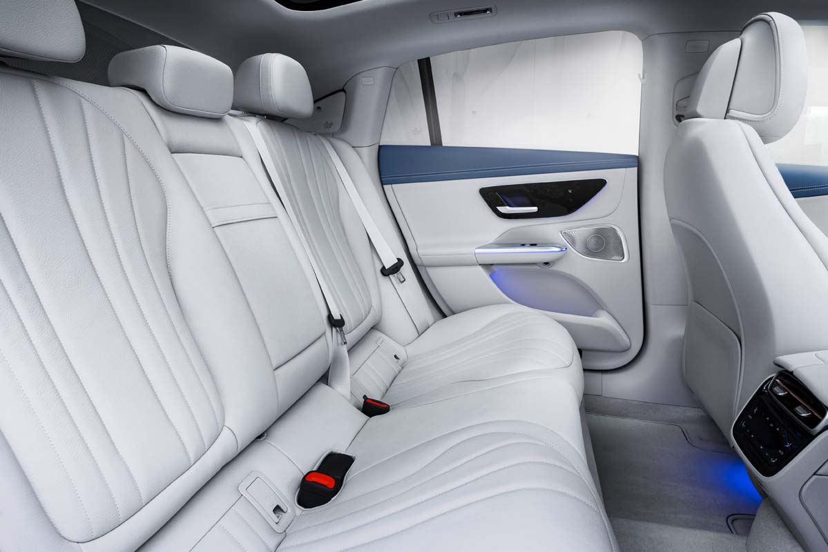 In the outer dimensions (length/width/height: 4946/1961/1512 millimetres), the EQE is comparable to the CLS. Like the latter, it has a fixed rear window and a boot lid. The interior dimensions even clearly exceed those of today’s E-Class (213 model series), e.g. the shoulder room in the front (plus 27 mm) or the interior length (plus 80 mm).