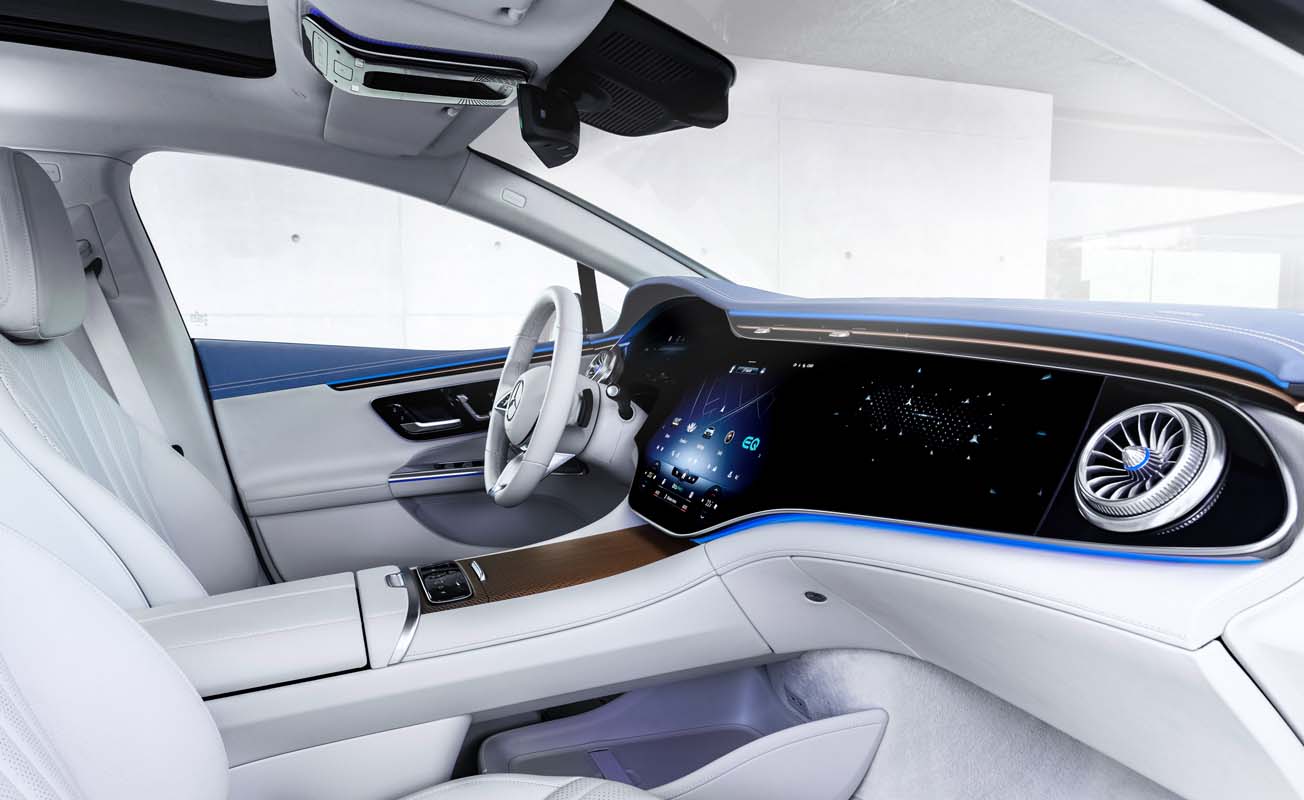 The MBUX Hyperscreen is the absolute highlight in the interior. This large, curved screen unit sweeps almost from A-pillar to A-pillar. Three screens sit under a common bonded glass cover and visually merge into one display. In addition to the zero-layer design, the MBUX Hyperscreen offers intuitive touch operation with haptic feedback and force feedback. The scratch-resistant glass is coated to make cleaning easier.