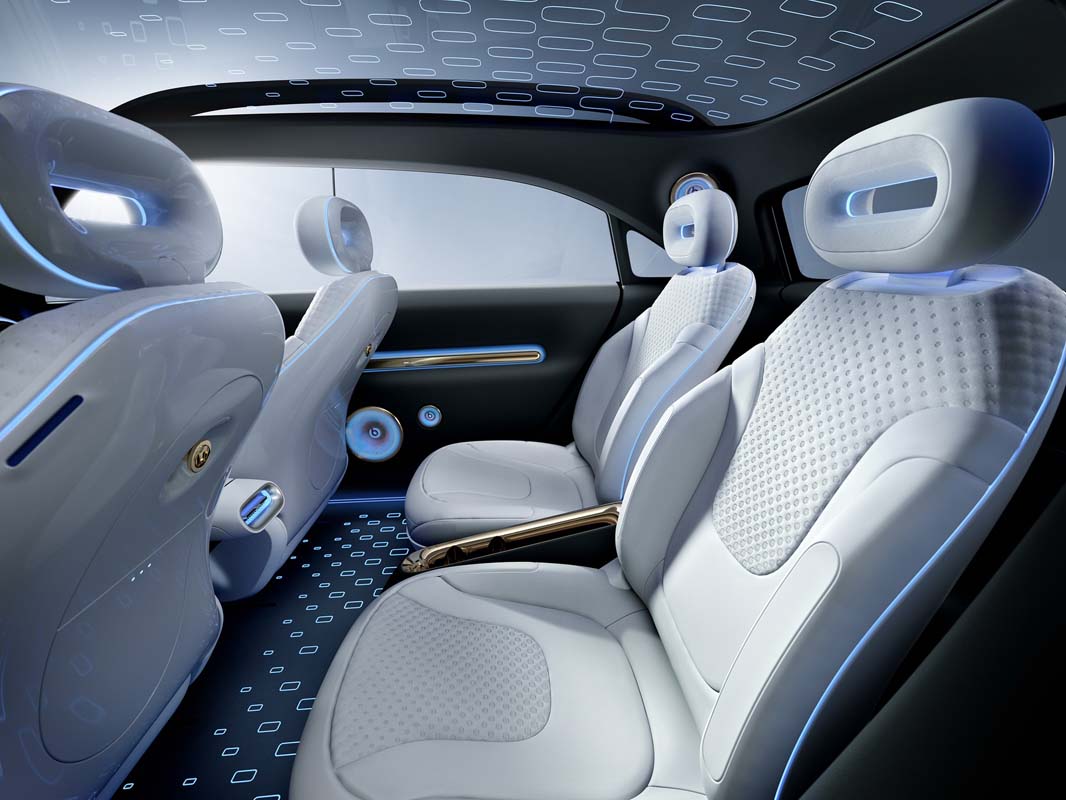 A first hint of the new dimension of digitalisation of future smart vehicles is provided by the concealed door handles, which are merely indicated by light elements. The rear doors of the smart Concept #1 are hinged at the back and open in the opposite direction from the front doors. This portal door concept makes it particularly easy to get in and out of the car. Plus, the absence of a B-pillar facilitates an unobstructed view of the generously dimensioned interior when the doors are open.