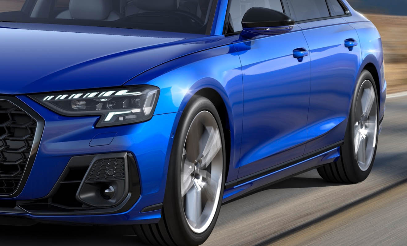 Thanks to the enhancement, the exterior of the A8 has an even more representative, confident, and athletic effect. To summarize, the newly designed and precisely orchestrated design elements in the front, side, and rear areas significantly increase the A8’s presence and authority and sharpen the profile of the brand’s top model. Beyond the basic exterior, Audi is offering its customers the chrome exterior package and, for the first time in the A8, the new S line exterior package. The look is even more defined with the additional black appearance package. The color swatch for the A8 includes eleven colors, among them the new metallic district green, firmament blue, Manhattan gray, and ultra blue. New in the Audi A8 are five matte colors – Daytona gray, florette silver, district green, and glacier white.