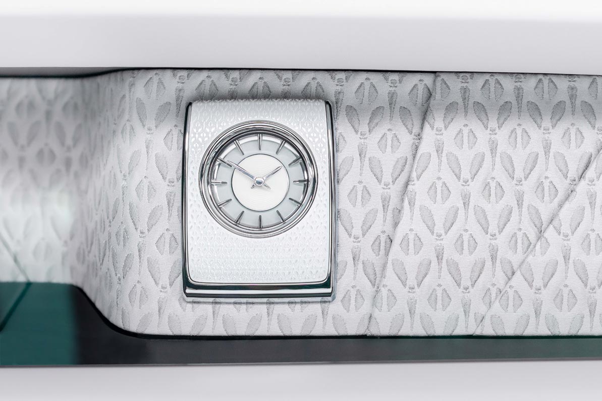 The same design also appears on Phantom’s dashboard timepiece. The surround is made from a 3D printed ceramic, a truly contemporary execution of a traditional material. Set into an iced finish woodset, the tonal properties of the interior take Phantom to a beautiful and unsurpassed level of opulence.