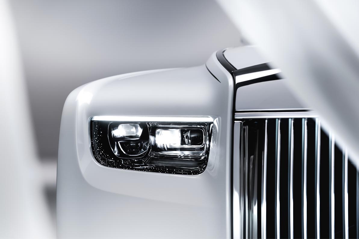 A subtle geometric change to the Pantheon Grille makes the ‘RR’ Badge of Honour and Spirit of Ecstasy mascot more prominent when viewed from the front. The grille itself is now illuminated, a feature debuted and popularised in Ghost. The headlights are graced with intricate laser-cut bezel starlights, creating a visual connection with the Starlight Headliner inside, and adding further surprise and delight to Phantom’s night-time presence.