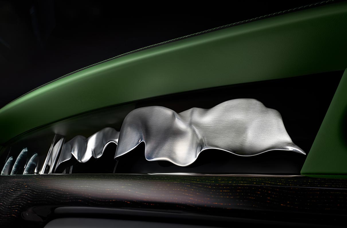 Both materials share an original repeating pattern based on an abstract interpretation of the Spirit of Ecstasy. In the silken textile, the design is smaller and woven into the fabric to create a more visually stimulating finish. It also appears in Phantom’s Gallery, right in the occupant’s line of sight, and on key touchpoints such as the armrest and centre console. The bamboo fabric is embroidered with larger icons, presenting a tufted appearance commonly found in interior design. This more resilient material is placed on the lower elements of the interior where they will need to withstand most contact.